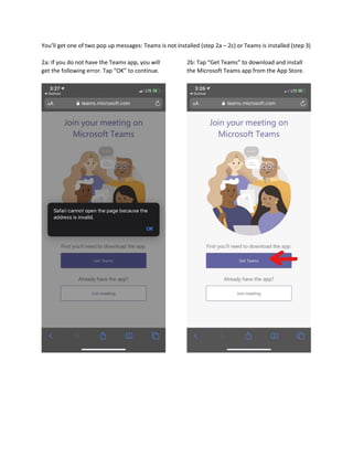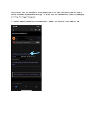This document provides 7 steps to join a Microsoft Teams meeting using an iPhone and the Microsoft Teams mobile app. It explains that you do not need a Teams account to join as a guest. If the Teams app is not installed, it guides the user to download and install it from the App Store. Once installed, it describes opening the meeting link in Teams and joining the meeting, where you may have to wait in the virtual lobby to be admitted, and how to access options like chat and participants during the meeting.