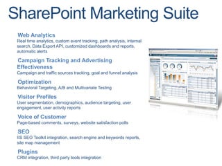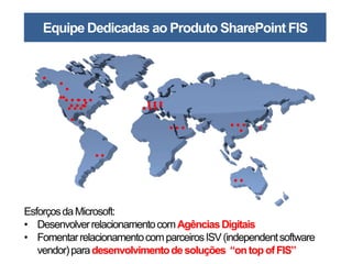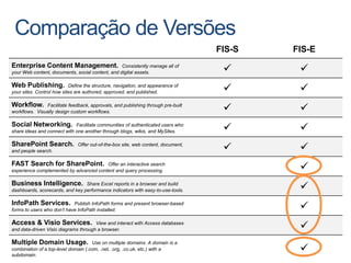 This document discusses SharePoint for internet sites (FIS). FIS allows organizations to build public websites and internet portals using SharePoint. It offers features for content management, web publishing, workflows, social networking, search, business intelligence, forms and analytics. FIS comes in two editions - Foundation (FIS-F) and Enterprise (FIS-E) that differ in capabilities. FIS provides a single platform for collaboration, dynamic content, security, templates and analytics to organizations developing public websites.