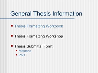 This document provides tips and tricks for formatting a thesis in Microsoft Word, covering topics such as margins, page numbers, styles, figures, tables, and tables of contents. It highlights differences between Word 2003 and 2007 and provides step-by-step instructions for formatting elements. Resources are also listed for those seeking additional help with thesis formatting in Word.