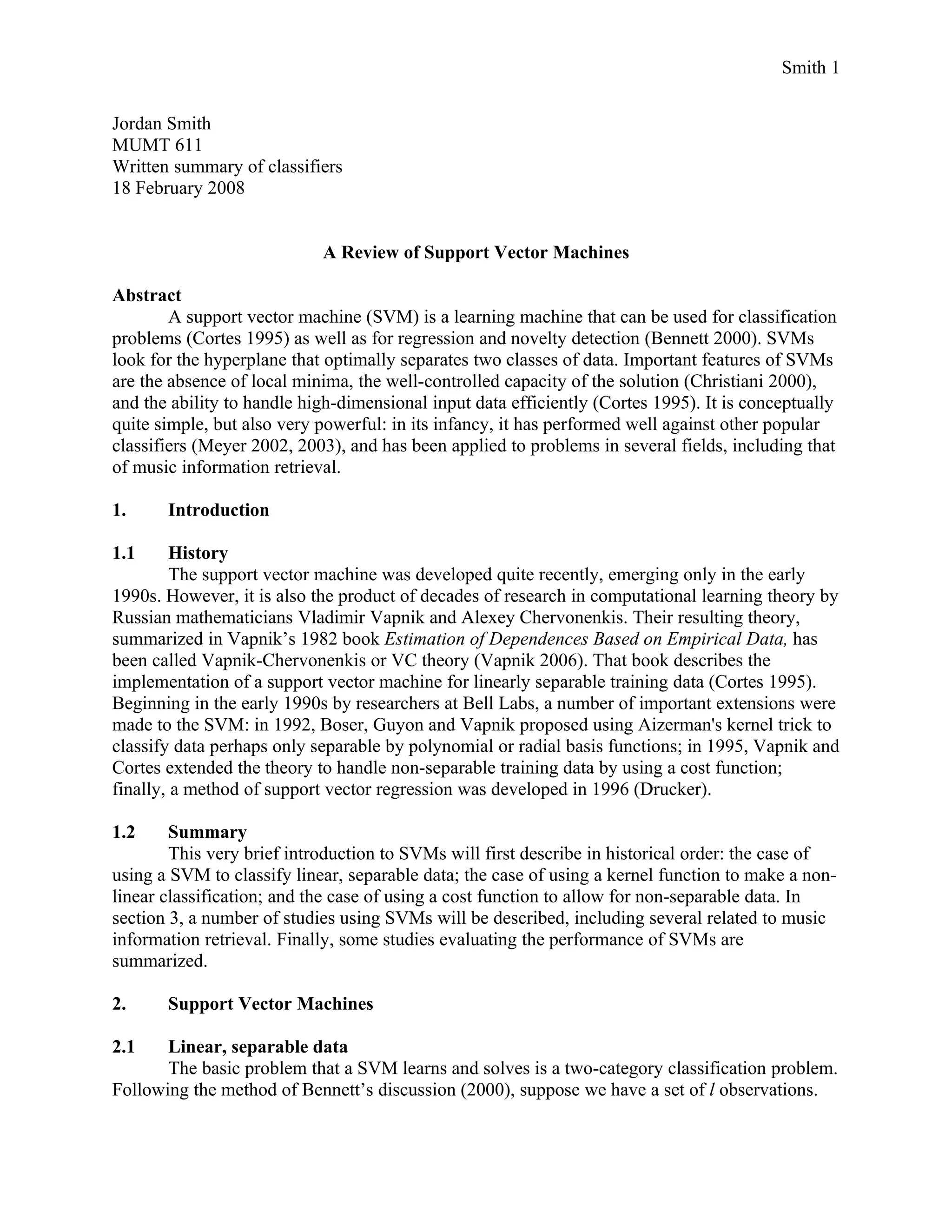 This document provides a 3-paragraph summary of support vector machines (SVMs). It begins with a brief history of SVMs from the 1990s work of Russian mathematicians Vapnik and Chervonenkis. It then explains how SVMs find the optimal separating hyperplane for classification problems, including methods for non-linear and non-separable data using kernel functions and cost functions. It concludes by noting applications of SVMs include text recognition, face detection, gene expression analysis, and music information retrieval tasks.