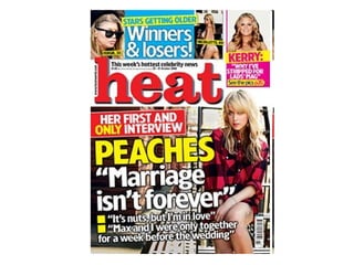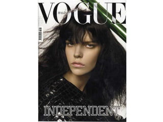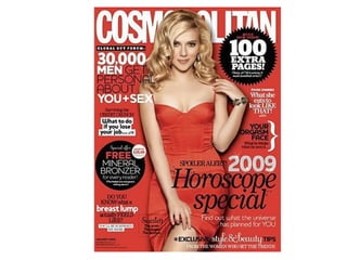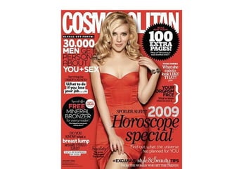 The document discusses various conventions and features commonly found on magazine front covers, including the masthead, tagline, central image, cover model, anchorage, secondary images, coverlines, mode of address, puffs, pugs, barcode/price/edition, use of color, and fonts. It explains that each element has a specific purpose in enticing readers to buy the magazine and understanding how they work is important for creating an effective front cover design.