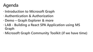 This document introduces Microsoft Graph and describes how to build applications that connect to Microsoft services like Office 365 using the Microsoft Graph API. It provides an overview of Microsoft Graph and how it acts as a gateway to access user, group and organizational data from Microsoft services. It also describes the various authentication options for Microsoft Graph applications and code samples for building single page applications with React that are authenticated with Azure AD using the Microsoft Graph SDK.