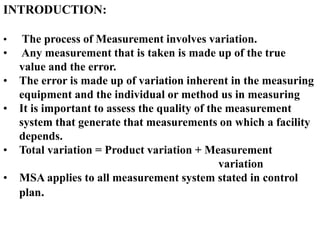 This document discusses measurement system analysis (MSA), which assesses the quality of measurement systems that generate measurements critical to a facility's operations. MSA applies statistical methods to evaluate six key properties (repeatability, reproducibility, accuracy, bias, linearity, stability) that characterize a measurement system's variation. Conducting an MSA is important when a new measuring device is introduced, to compare measurement devices, or when required by a customer's control plan. The document outlines methods like variable and attribute gauge studies to evaluate a measurement system, and provides acceptance criteria to determine if a system is acceptable based on the percentage of variation attributed to the gauge.
