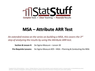 The document outlines the steps to build a Measurement System Analysis (MSA), which includes planning, conducting, analyzing results, and improving the measurement system. It specifically details the use of the Attribute Agreement Analysis (AAR) tool for analyzing discrete data and provides instructions on how to compile and interpret data using Minitab and Excel. The focus is on ensuring accurate measurement results by evaluating repeatability and reproducibility through statistical methods.