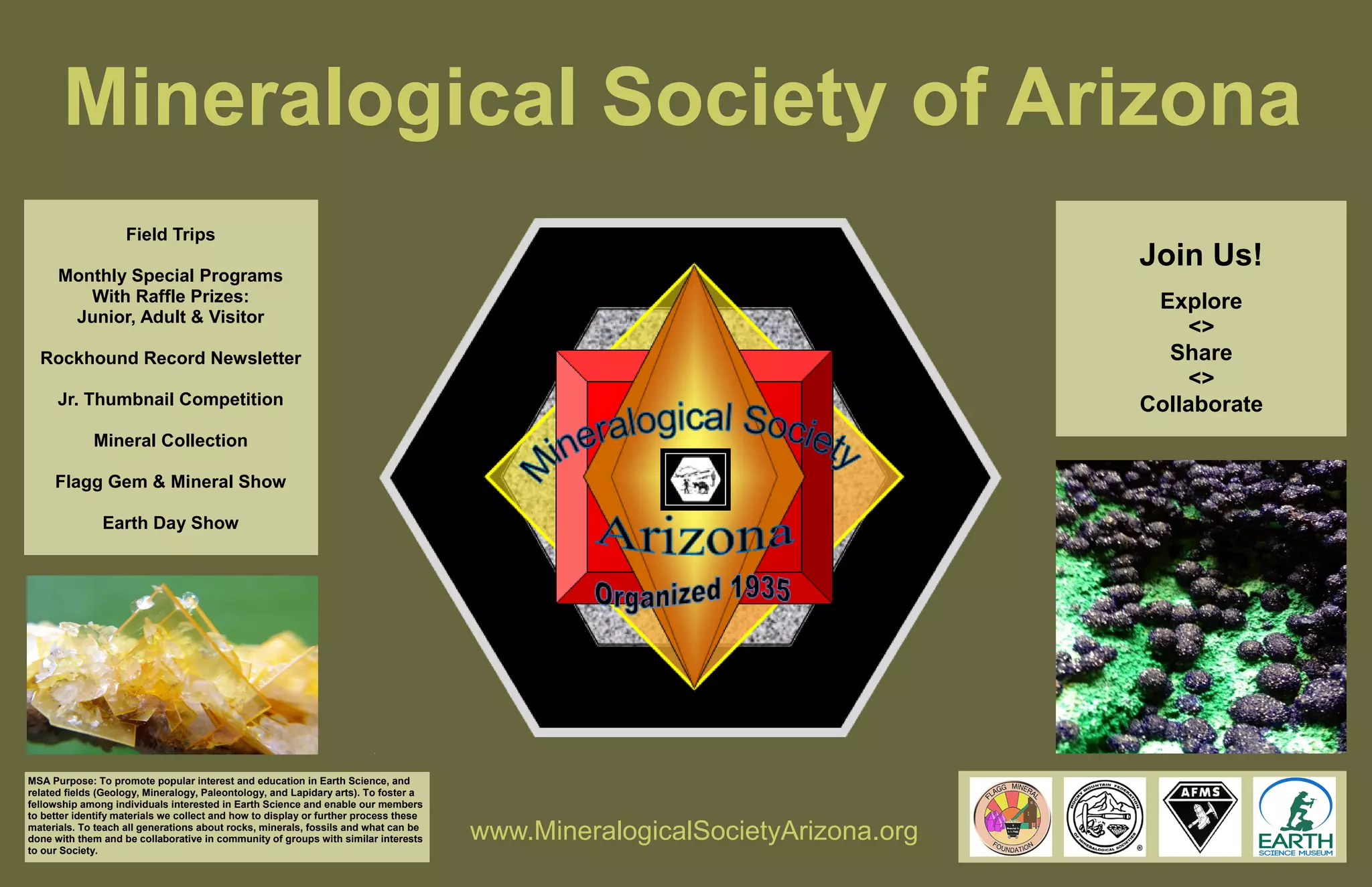The Mineralogical Society of Arizona hosts monthly field trips and special programs, including a rockhound record newsletter and competitions. Its mission is to promote interest and education in earth sciences, fostering community among individuals passionate about geology, mineralogy, and related fields. The society aims to educate all generations about rocks and minerals while encouraging collaboration with similar groups.