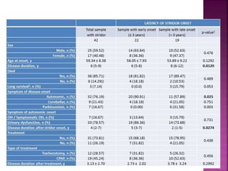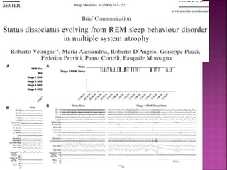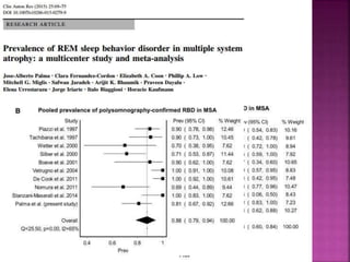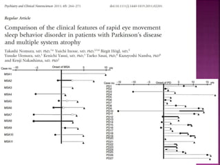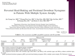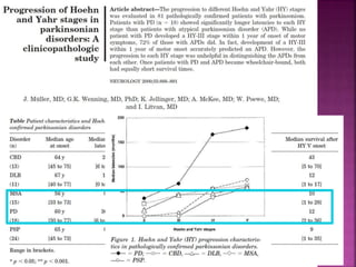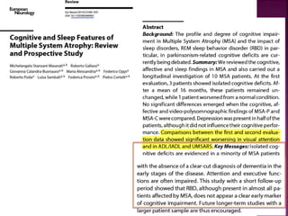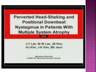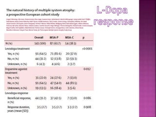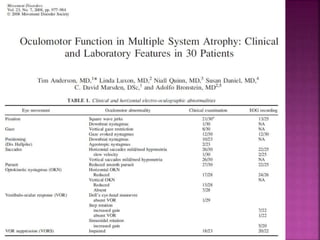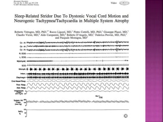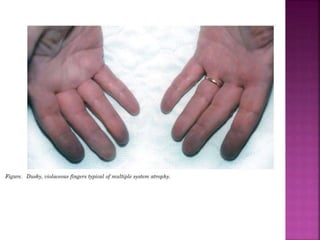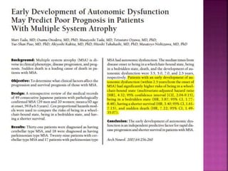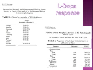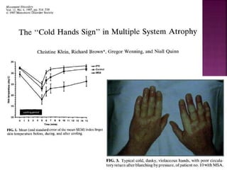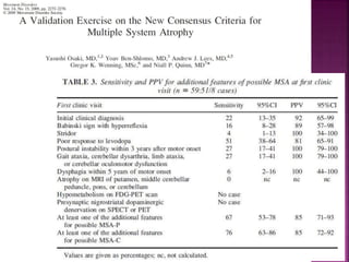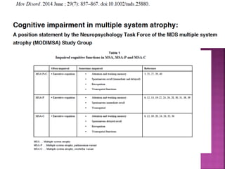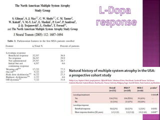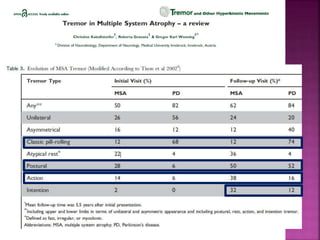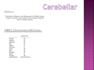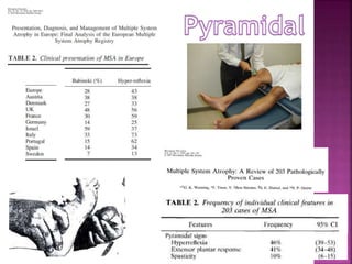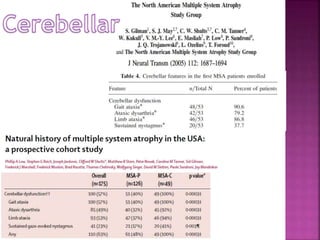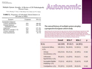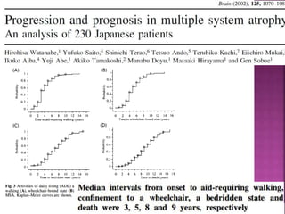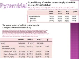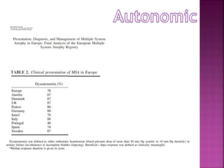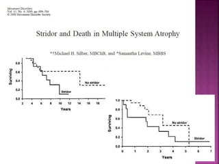 This document summarizes information about multiple system atrophy (MSA). MSA is a neurodegenerative disorder characterized by autonomic failure and motor symptoms. It has an estimated incidence of 0.6-0.7 per 100,000 people per year. Common features include parkinsonism in at least 90% of patients, orthostatic hypotension, and urinary dysfunction in over 80% of cases. The document discusses the types of tremors seen in MSA, respiratory issues like stridor, and prognostic factors like the presence of urinary incontinence which are associated with shorter survival times.