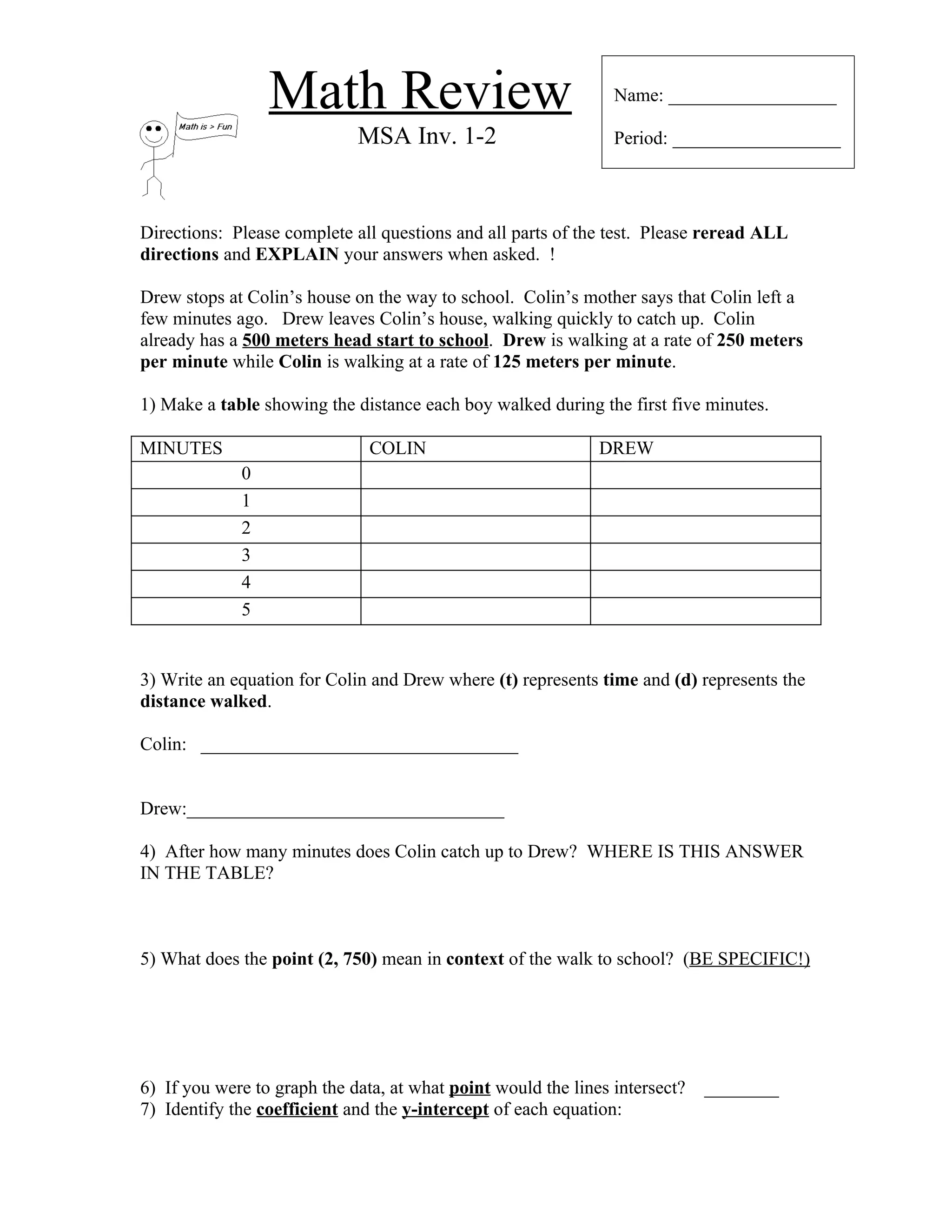 This math review document contains a word problem about two boys, Colin and Drew, walking to school at different rates. It then provides 8 questions to complete, including: