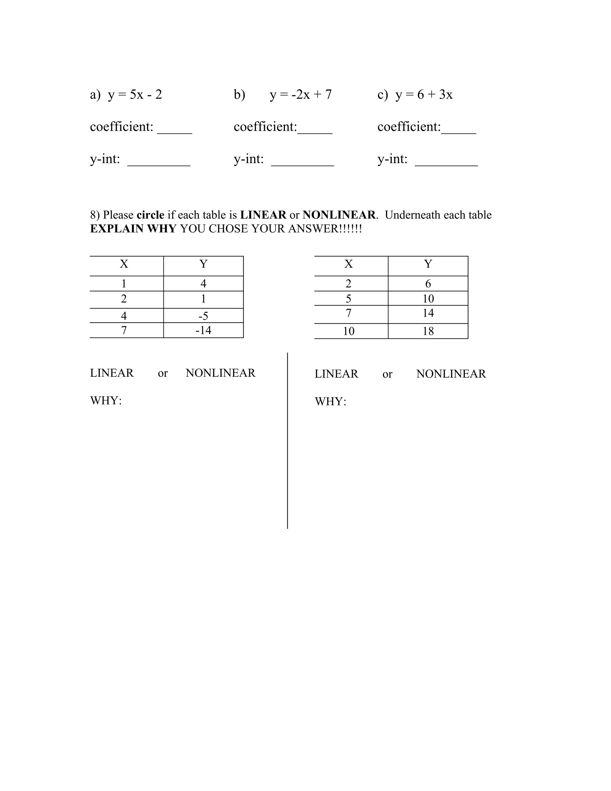 6) Determining if two tables show linear or nonlinear relationships and explaining the reasoning.