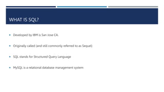 This document provides an overview of SQL and MySQL. SQL is a relational database management system originally developed by IBM. It allows users to connect to a database server and query or modify data. MySQL is a free, open-source SQL database. It provides more power and reliability than Microsoft Access. With SQL, the database resides on a server and users can connect via the web to access and edit data. phpMyAdmin provides a graphical interface for managing MySQL databases.
