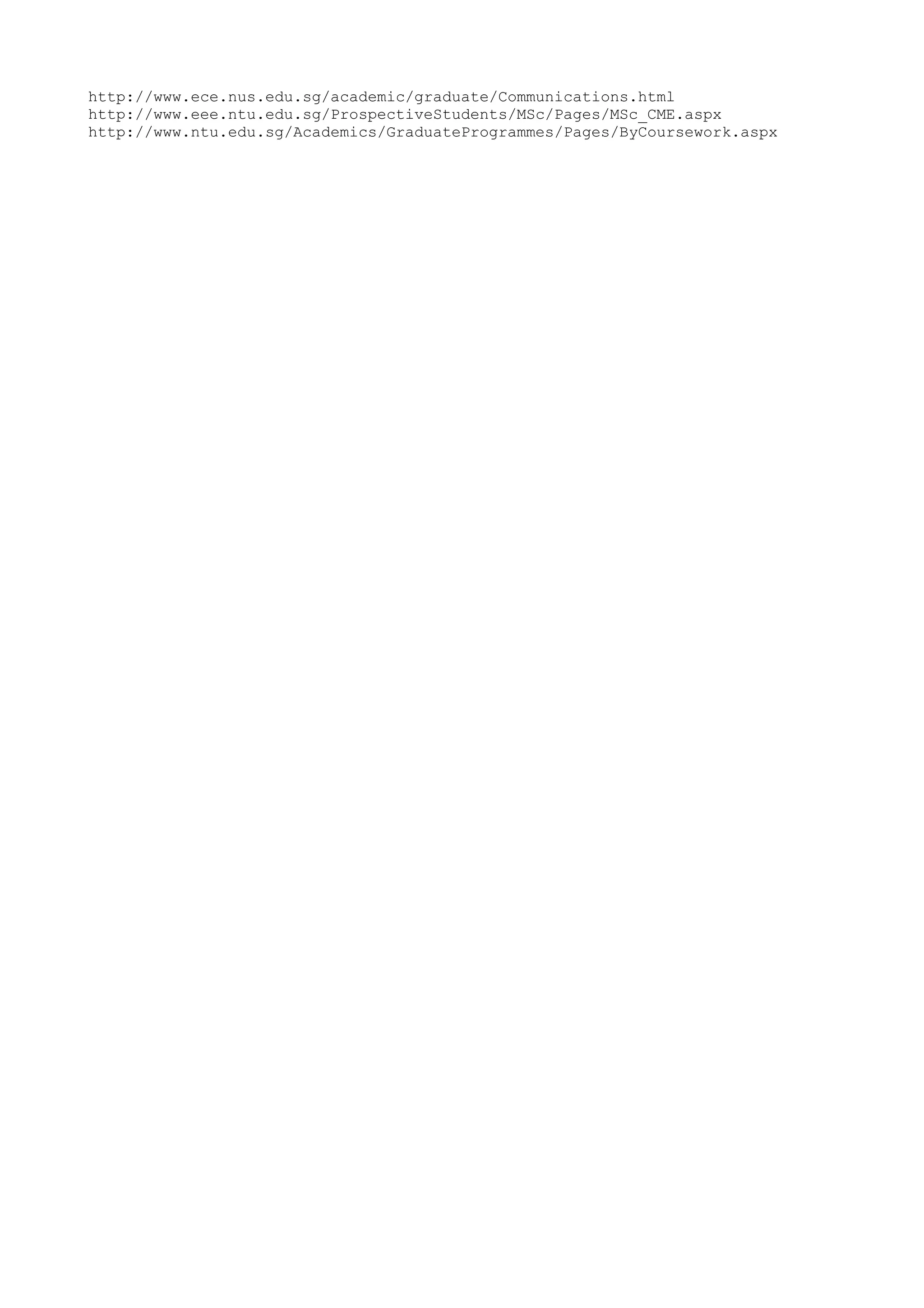 The National University of Singapore's Department of Electrical and Computer Engineering offers a Master of Science in Communications and Signal Processing that provides students with advanced knowledge in areas such as wireless communications, signal processing, and networking. The Nanyang Technological University's School of Electrical and Electronic Engineering offers a similar Master of Science in Communications Engineering program that focuses on advanced topics in communications systems, signal processing, and networking technologies. Both universities provide coursework master's programs that can be completed in 1-2 years.