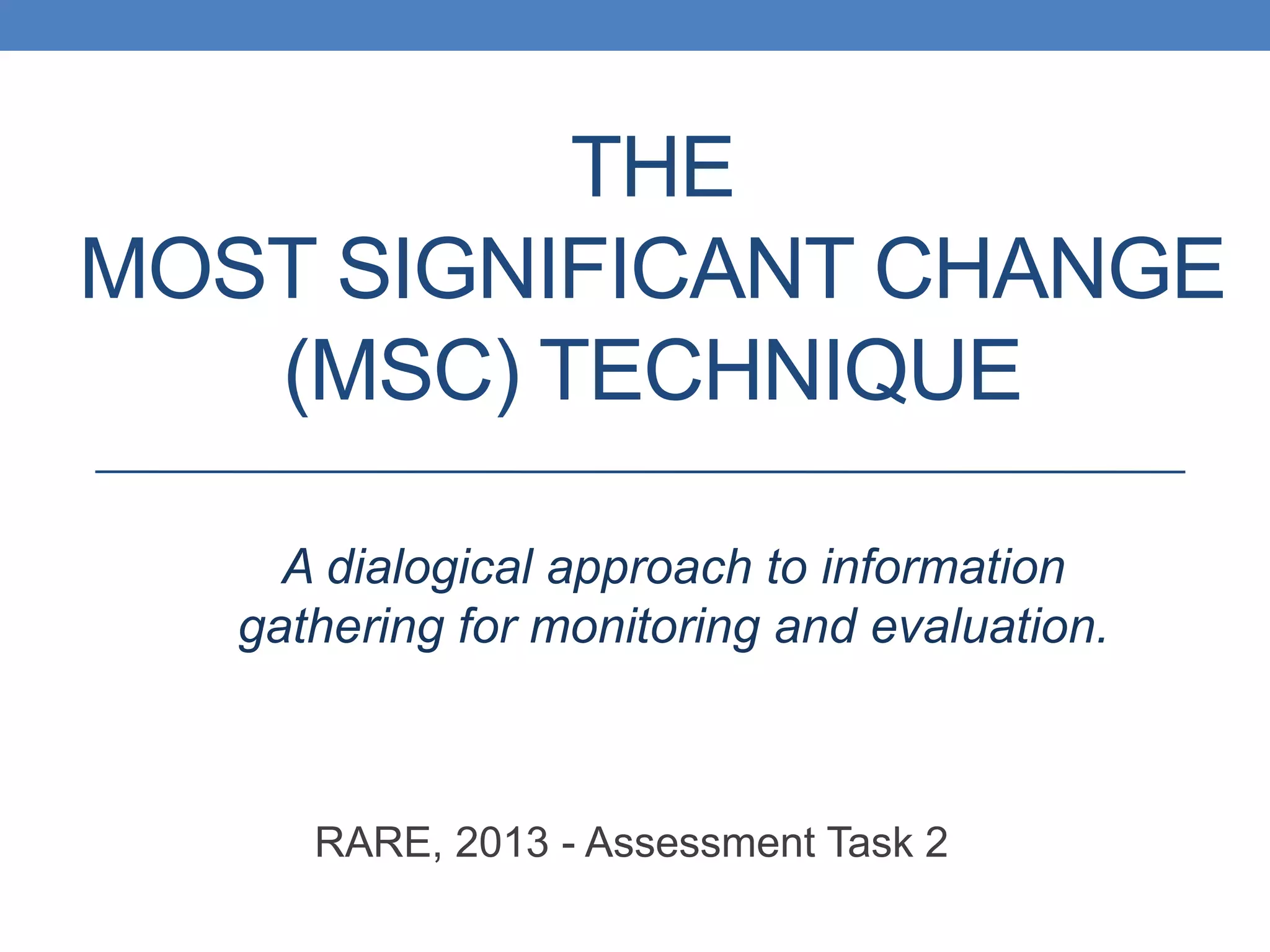 This document provides an overview of the Most Significant Change (MSC) technique for monitoring and evaluation. MSC is a participatory approach that collects qualitative stories from participants about program impacts in their own words. It involves collecting stories, discussing and categorizing them, selecting the most significant changes, and using the insights for program improvement. The document outlines the MSC process, appropriate and inappropriate uses, strengths such as participatory learning and weaknesses like high costs. It also provides an example of MSC in action through a video link and proposes an activity for participants.