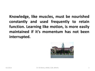 The document provides information about the M.Sc. Nursing program at BPKIHS. It discusses the program's philosophy of preparing nurses for leadership roles and research. It outlines the curriculum, including courses offered over three years in areas like education, management, and various clinical specialties. A calendar shows the schedule of coursework, practicums, and study blocks for the first year of the 2013-2014 session.