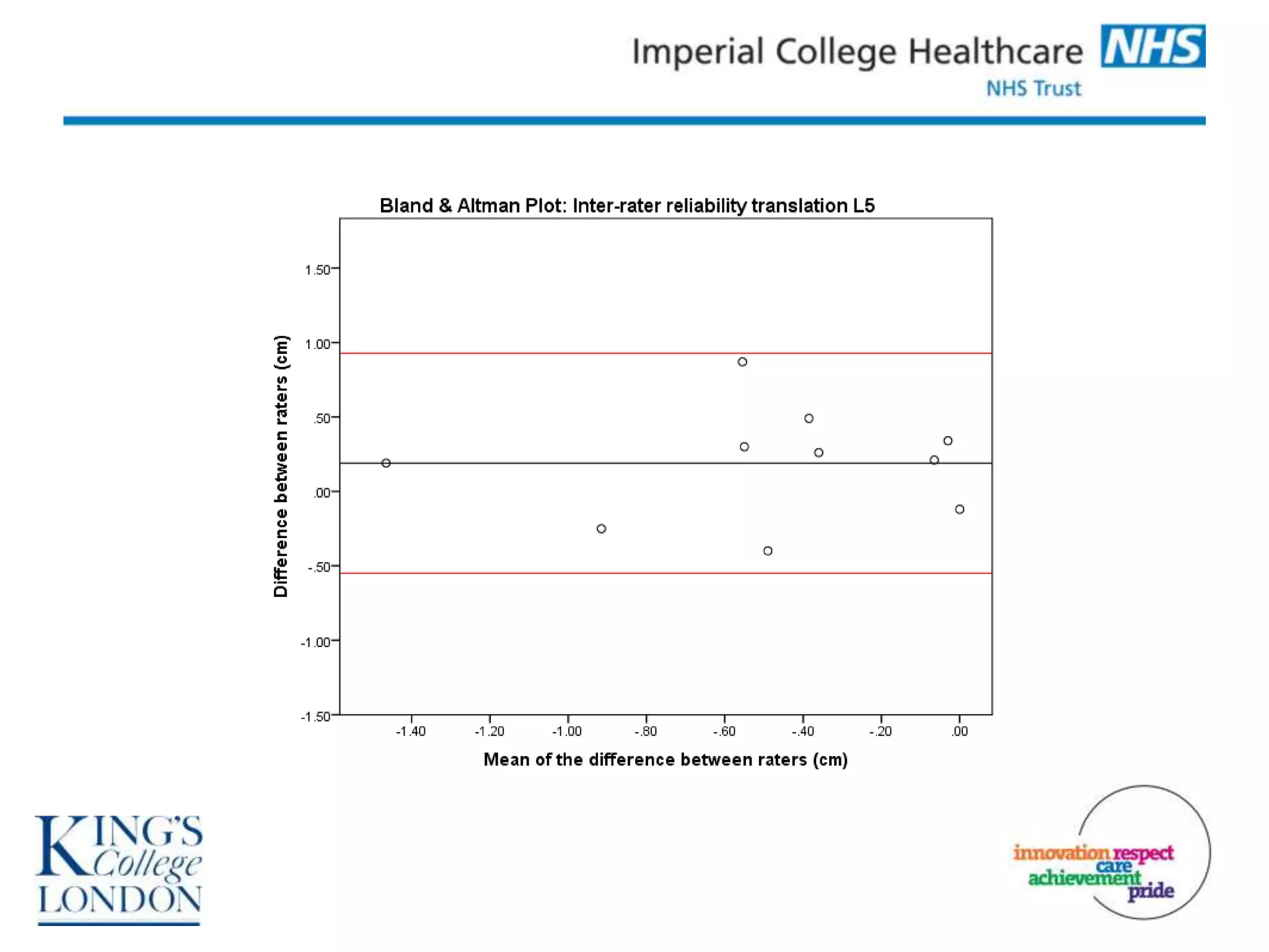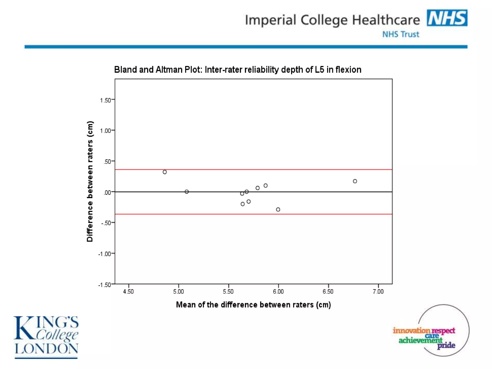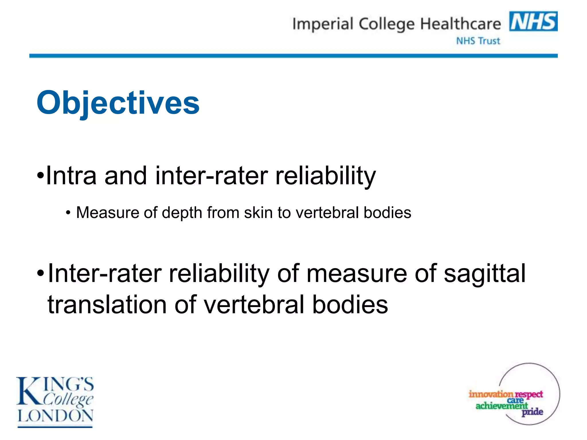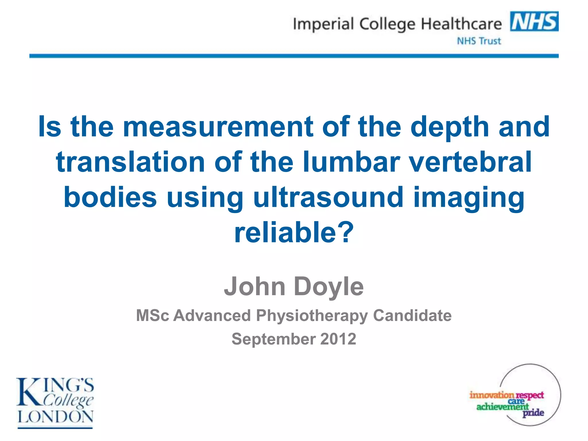 This document examines the reliability of using ultrasound imaging to measure the depth and translation of lumbar vertebral bodies. It finds that intra-rater and inter-rater reliability for measuring depth is good, with intraclass correlation coefficients above 0.9. However, measuring sagittal translation between flexion and extension has higher error. While ultrasound shows potential for identifying spondylolisthesis, comparisons to gold standards and controlling for transducer pressure are needed.