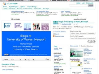 This document discusses potential research into how students use Web 2.0 tools and how that relates to social learning theories. It outlines how social networking, user-created content, and information gathering are key aspects of Web 2.0 and students. The proposed research question is how students' use of Web 2.0 tools ties into existing knowledge about social learning theories. Interviews, focus groups, and analyzing tool usage are suggested methodologies, with anticipated risks being getting a range student perspectives and the changing nature of Web 2.0 tools.