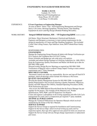 This document provides a summary of an engineering manager's experience and qualifications. It outlines over 39 years of experience managing engineering teams and designing heavy lift cranes, mooring equipment, winches/hoists, and pipe handling equipment. Recent experience includes 8 years as an engineering manager directing structural, mechanical, electrical, and hydraulic engineers to design cranes and pipe handling equipment while ensuring compliance with quality standards. The candidate has extensive experience in engineering, quality management, document control, technical publications, and service support.