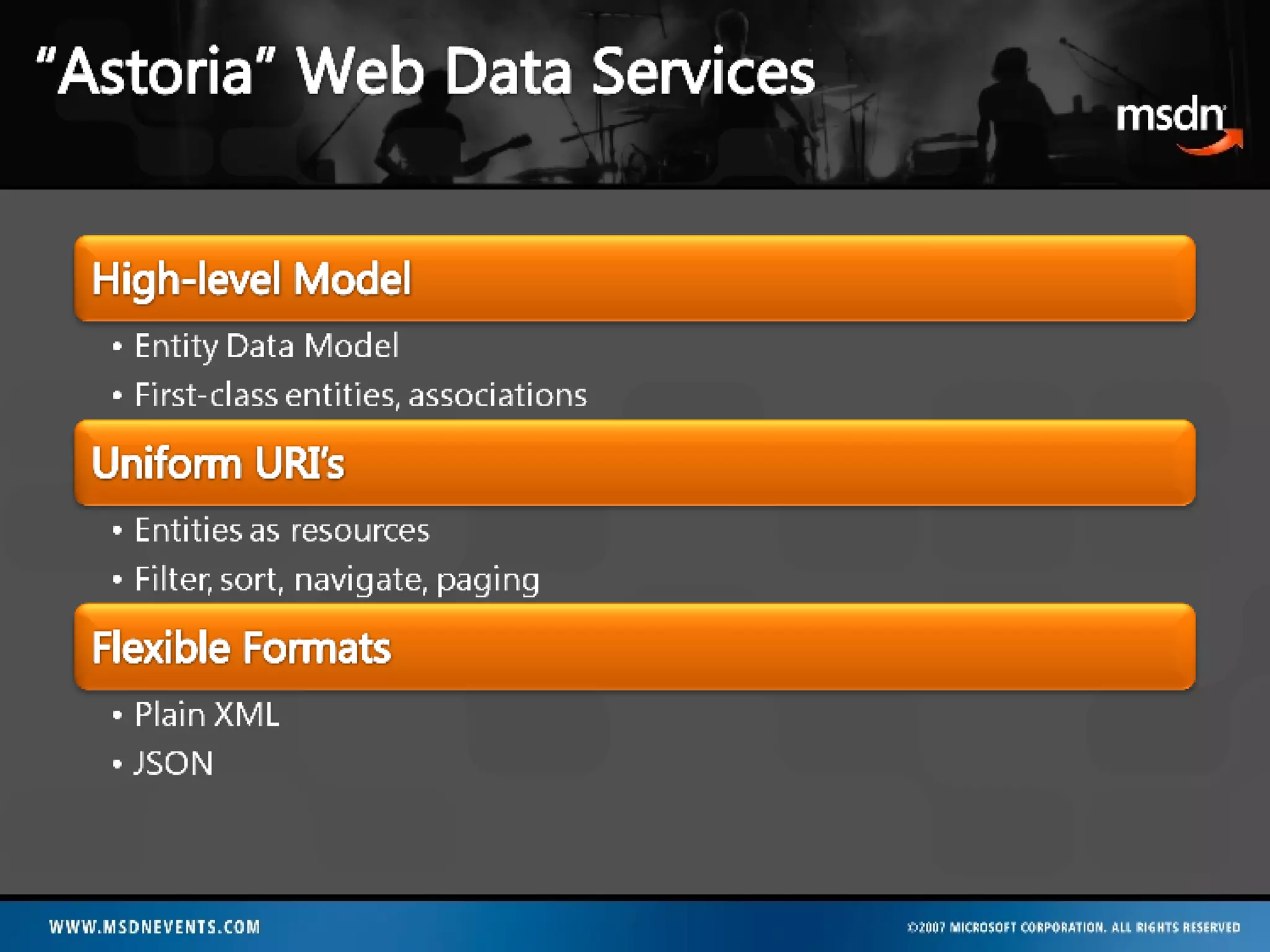 2. Astoria allows data to be exposed and consumed via URIs using LINQ queries and formats like JSON.