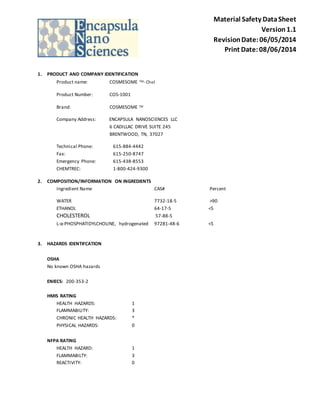 This Material Safety Data Sheet (MSDS) provides essential information about the product Cosmesome TM-Chol, including its composition, potential hazards, first aid measures, and safety precautions. The primary hazards include flammability and potential health effects from inhalation, skin contact, or ingestion. Proper handling and storage conditions are recommended to ensure safety, alongside emergency contact information.
