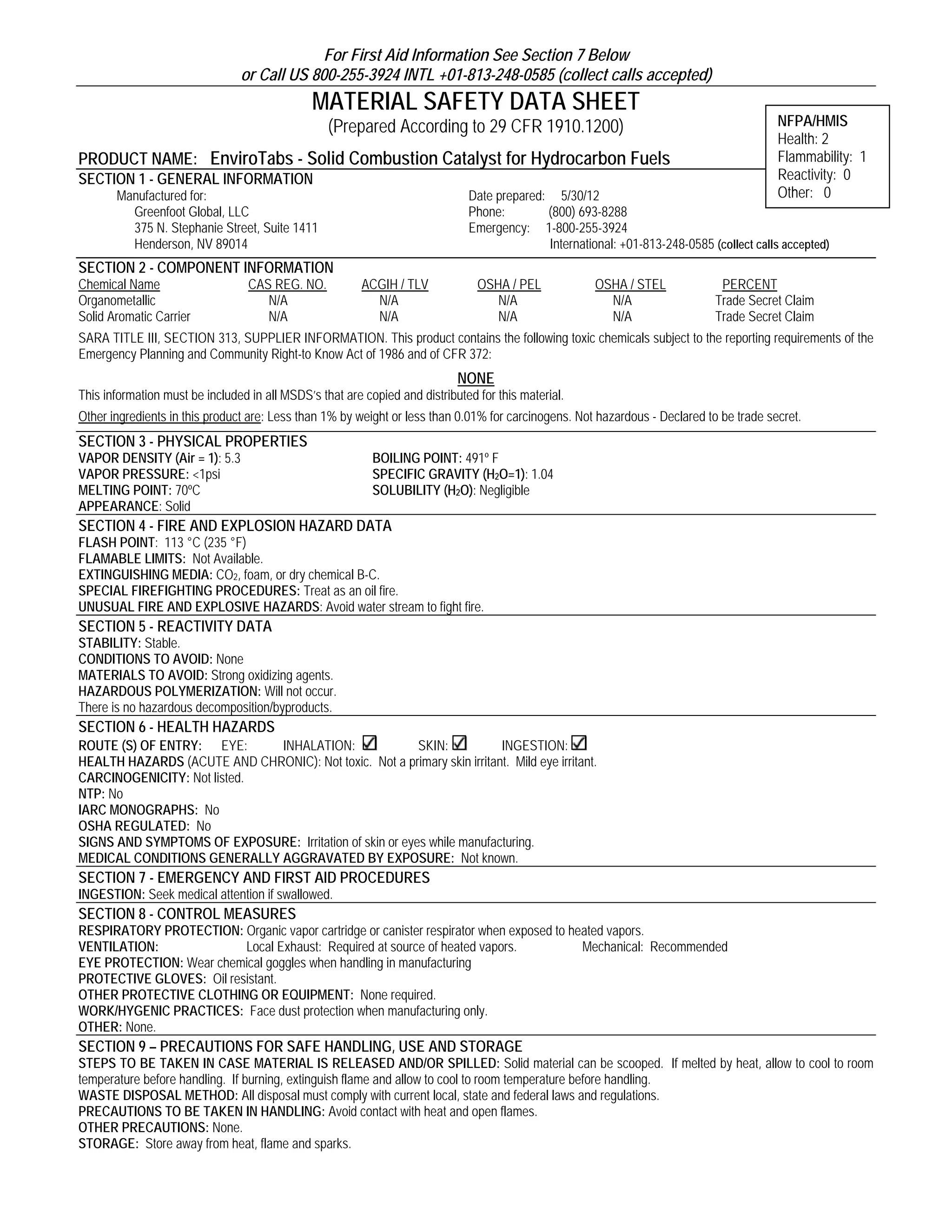 This document provides a material safety data sheet for EnviroTabs, which are solid combustion catalysts for hydrocarbon fuels. The product contains an organometallic compound and solid aromatic carrier. It is a mild eye irritant but is otherwise not toxic. In an emergency, call the number provided. The product should be stored away from heat, flame, and sparks. Proper protective equipment should be worn when handling.