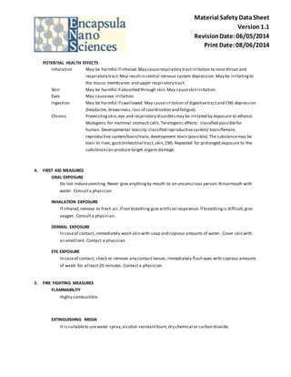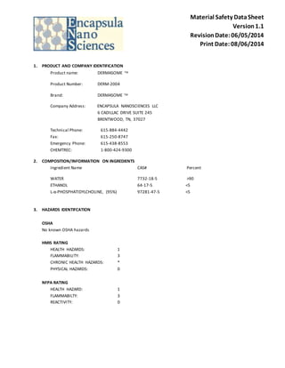 The document is a Material Safety Data Sheet (MSDS) for Dermasome TM, detailing its composition, hazards, first aid measures, fire-fighting measures, and safety precautions. Key ingredients include water, ethanol, and L-α-phosphatidylcholine, with notable health risks from inhalation and skin absorption, alongside chronic effects and potential carcinogenic properties. Proper handling, storage, and disposal methods are outlined to mitigate risks associated with this highly flammable product.