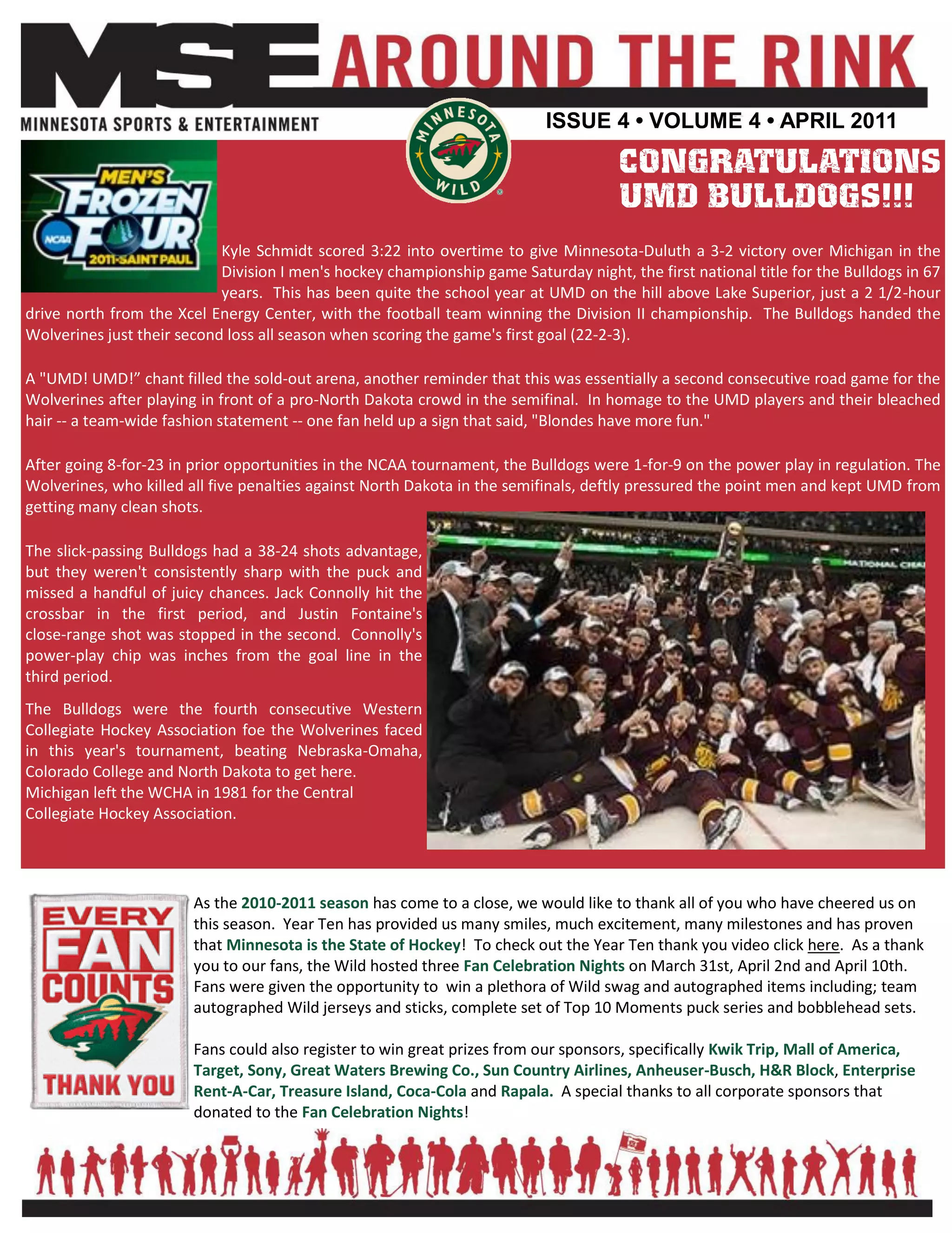 The Bulldogs of Minnesota-Duluth won their first men's hockey national championship in 67 years by defeating Michigan 3-2 in overtime. This capped off a successful athletic year for UMD with their football team also winning a national title. Kyle Rau of Eden Prairie High School was named Mr. Hockey for the top senior boys hockey player in Minnesota. The Minnesota Wild signed defenseman Chay Genoway, a Hobey Baker Award finalist from UND, to an entry level contract.