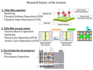 The document provides an overview of a lecture on thin film deposition techniques given by Dr. Toru Hara. It discusses four main applications of thin films: 1) electronic semiconductor devices using band engineering, 2) optical coatings using refractive index engineering, 3) optoelectronic devices using both band and refractive index engineering, and 4) quantum devices using quantum dynamics design. It also describes common thin film deposition methods including chemical solution deposition, chemical vapor deposition, plating, and physical vapor deposition techniques and gives examples of their use in applications such as transistors, optical coatings, LEDs, and superlattices.