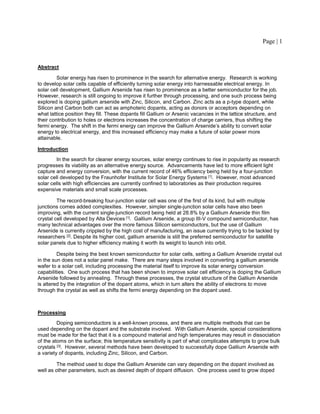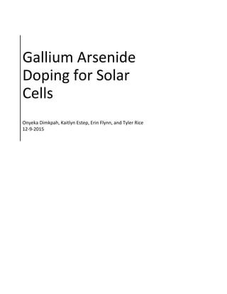 The document discusses the advancements in gallium arsenide (GaAs) doping for solar cells, highlighting its potential as a superior semiconductor for efficient solar energy conversion. Doping with elements like zinc, silicon, and carbon alters the electrical properties and lattice structure of GaAs, improving its photovoltaic efficiency. Various methods for doping, such as metal-organic vapor phase epitaxy (MOVPE) and molecular beam epitaxy (MBE), are explored to optimize performance and address challenges inherent in the doping process.