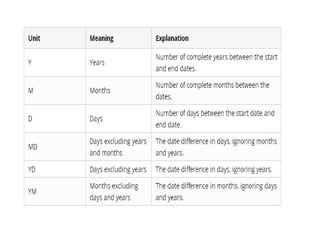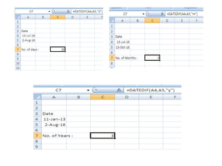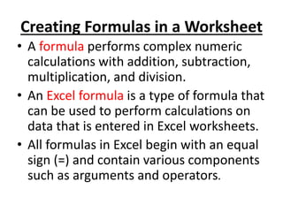 This document explains how to create formulas and functions in Microsoft Excel, detailing the process of inputting calculations and common functions such as SUM, AVERAGE, and COUNT. Formulas begin with an equal sign and can include various components like arguments and operators, while functions are predefined calculations with specific purposes. It also covers the usage of the DATEDIF function to calculate intervals between dates.