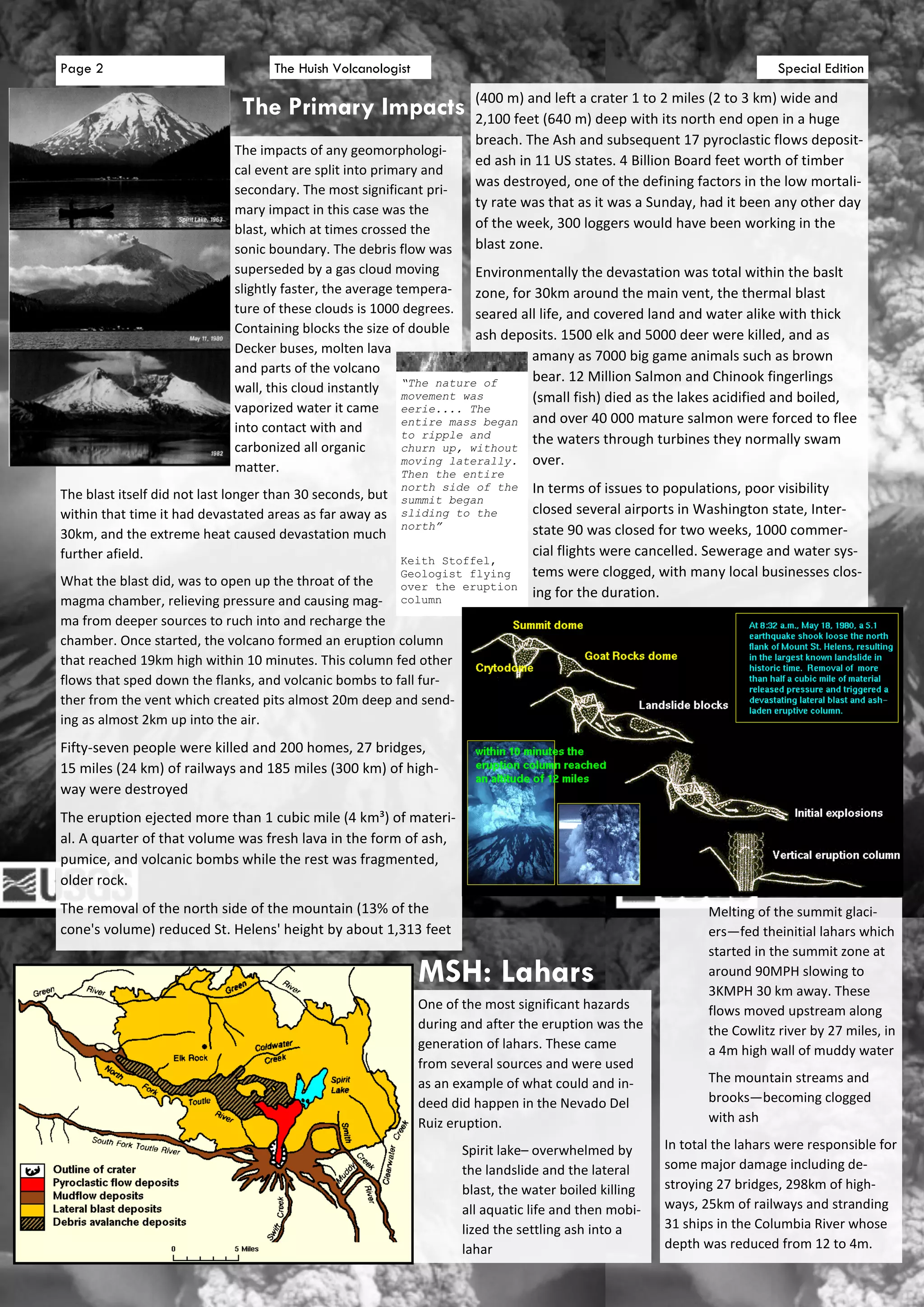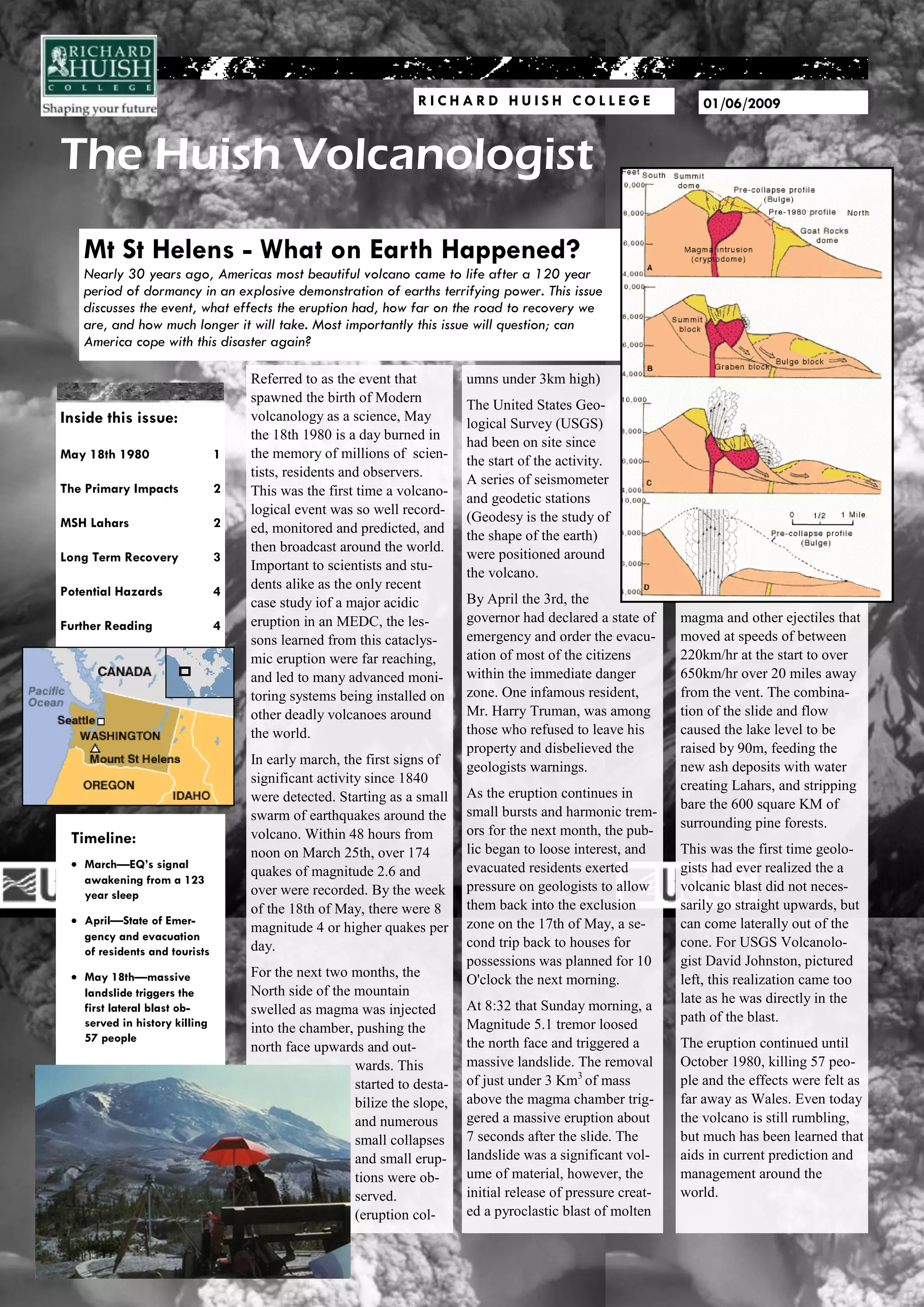 The document discusses the 1980 eruption of Mount St. Helens, highlighting its explosive nature after 120 years of dormancy, the extensive destruction it caused, and the subsequent lessons learned regarding volcanic monitoring and hazard management. The eruption, which resulted in the deaths of 57 people and significant environmental damage, has provided valuable data for understanding volcanic activity and improving response strategies for future eruptions. Recovery efforts and the lasting socio-economic impacts of the eruption are also addressed, emphasizing the ongoing importance of geological study and preventative measures.