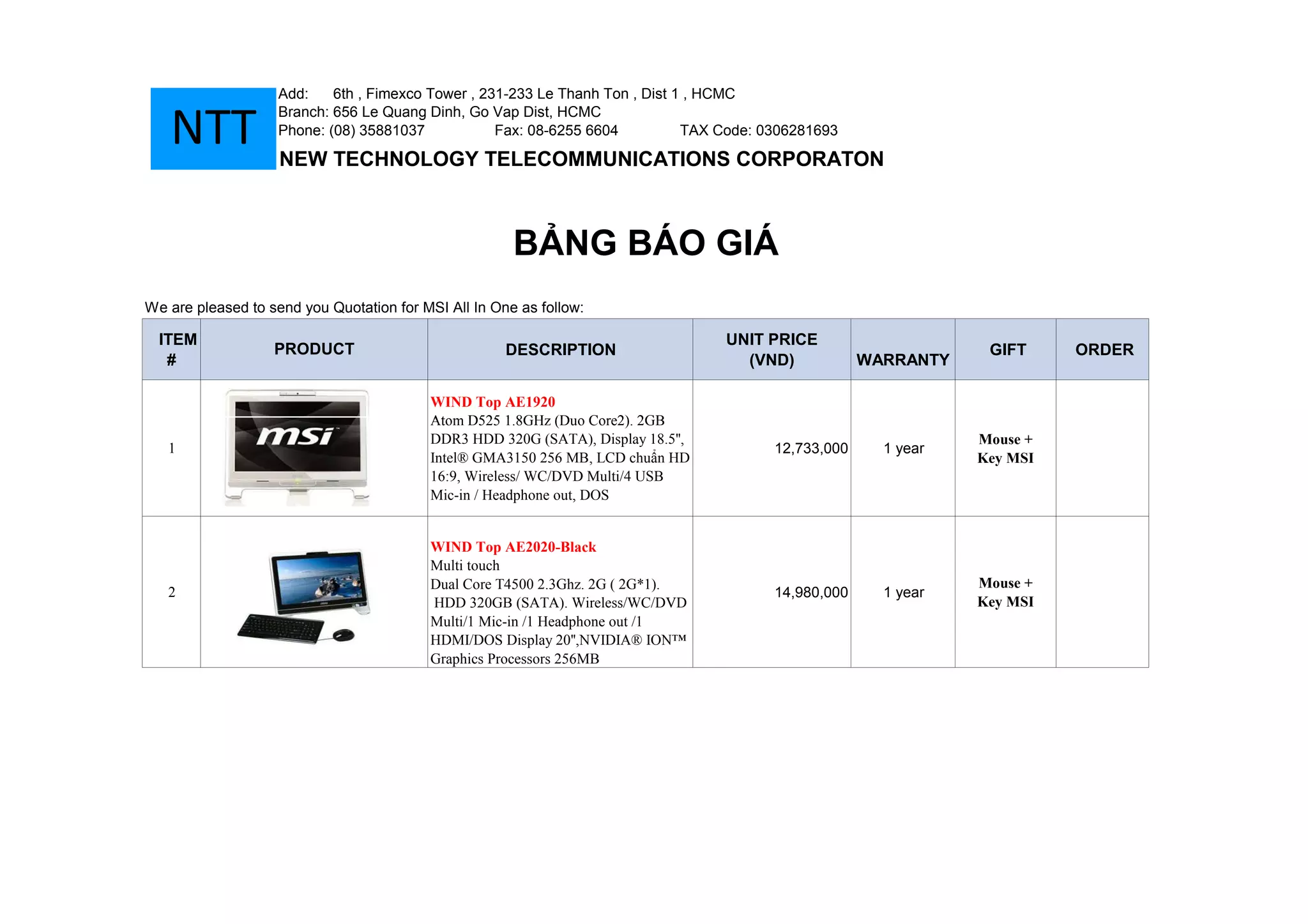 1. The document is a quotation from New Technology Telecommunications Corporation providing pricing and specifications for various MSI All-In-One desktop computers.