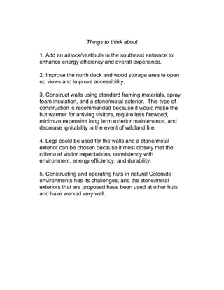 This document provides suggestions for renovating a research cabin located in the San Juan Mountains in Silverton, Colorado. It recommends adding an airlock/vestibule to improve energy efficiency, improving the north deck and wood storage area to open views, and constructing walls using standard framing, spray foam insulation, and a stone/metal exterior for improved insulation, reduced fire risk, and lower maintenance costs. Using logs for the walls and a stone/metal exterior is suggested to meet expectations of visitors and the environment while improving efficiency and durability. Operating research huts in natural areas has challenges, and stone/metal exteriors have worked well at other huts.