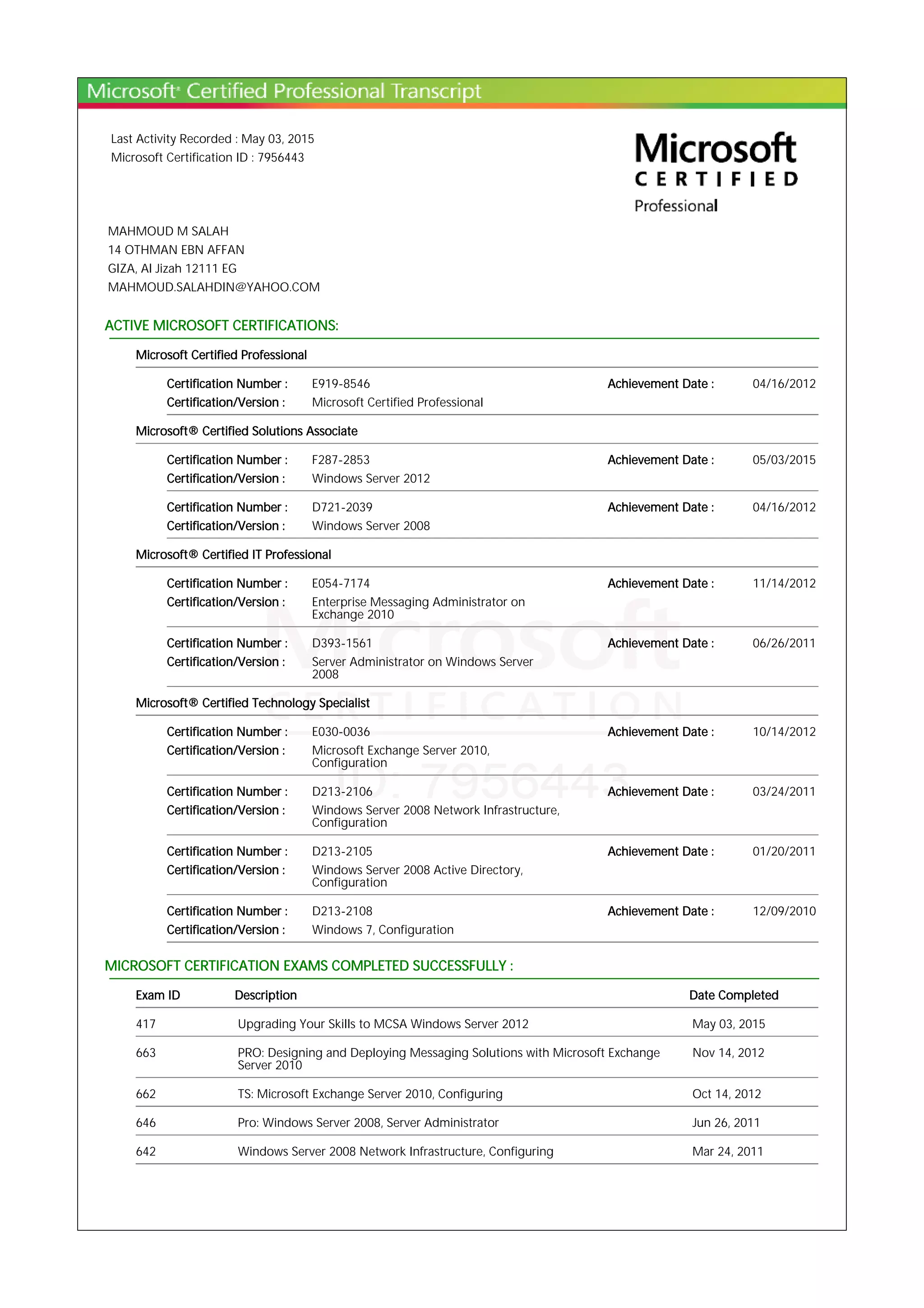 This document provides details of Mahmoud M Salah's Microsoft certifications. It lists his certification ID, name, address and email. It then outlines the various Microsoft certifications he holds, including Microsoft Certified Professional, Microsoft Certified Solutions Associate and Microsoft Certified IT Professional. For each certification, it provides the certification number and date achieved. It concludes by listing the Microsoft certification exams he has successfully completed, along with the exam ID and description.