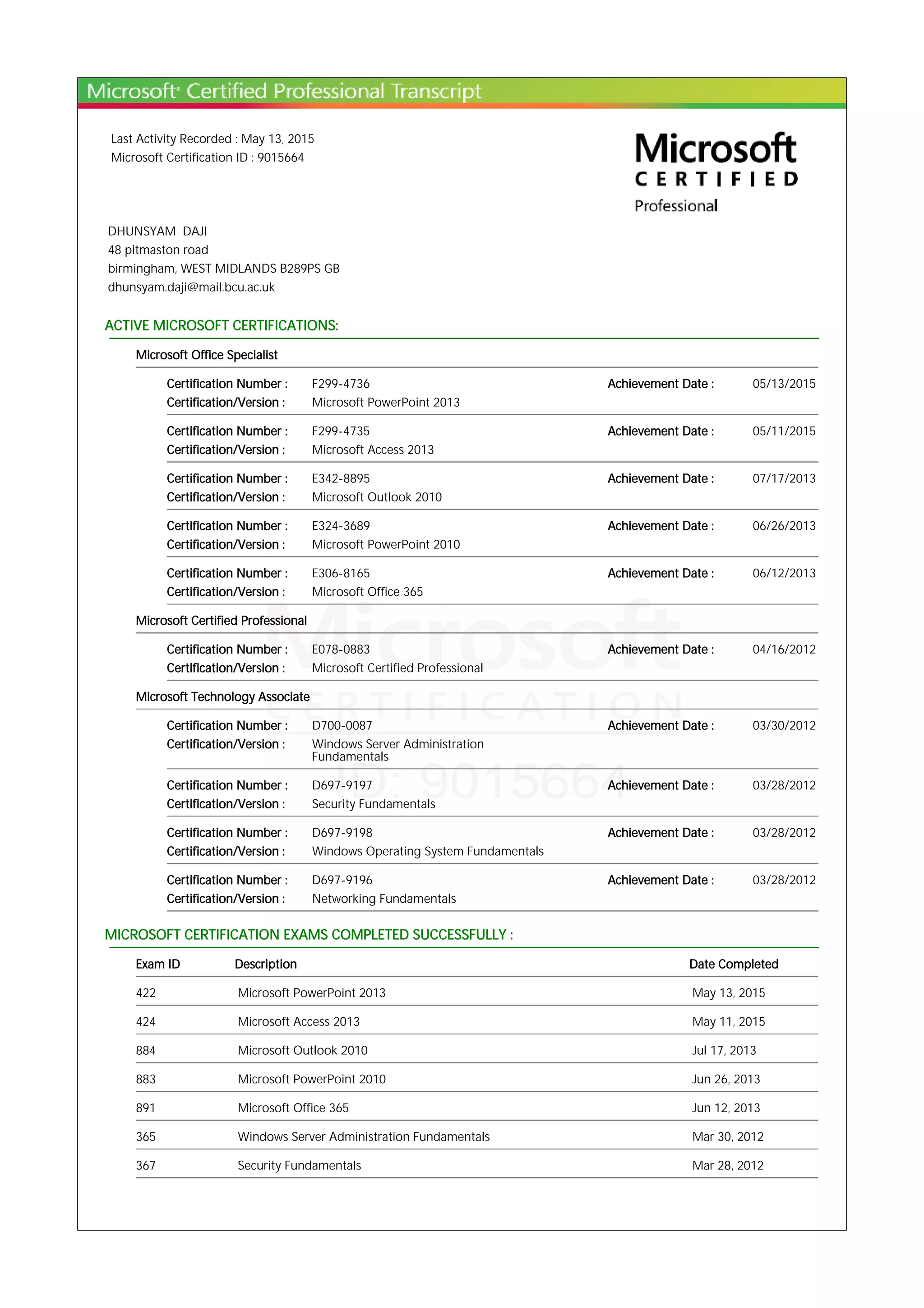 Dhunsyam Daji has several active Microsoft certifications including Microsoft PowerPoint 2013, Microsoft Access 2013, Microsoft Outlook 2010, Microsoft PowerPoint 2010, and Microsoft Office 365 which were achieved between May 2015 and July 2013. He also holds certifications for Microsoft Certified Professional achieved in April 2012, and Microsoft Technology Associate certifications in Windows Server Administration Fundamentals, Security Fundamentals, Windows Operating System Fundamentals, and Networking Fundamentals achieved between March and April 2012. The document provides details of Dhunsyam Daji's certification IDs, versions, and dates of achievement for his Microsoft certifications.