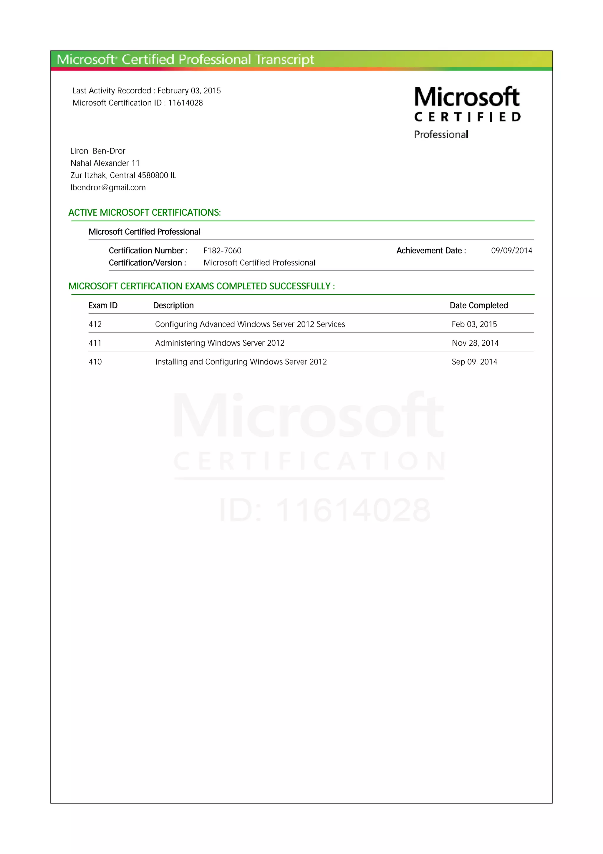 Liron Ben-Dror of Zur Itzhak, Israel has successfully completed three Microsoft certification exams, earning the Microsoft Certified Professional certification. The exams passed include Configuring Advanced Windows Server 2012 Services, Administering Windows Server 2012, and Installing and Configuring Windows Server 2012.