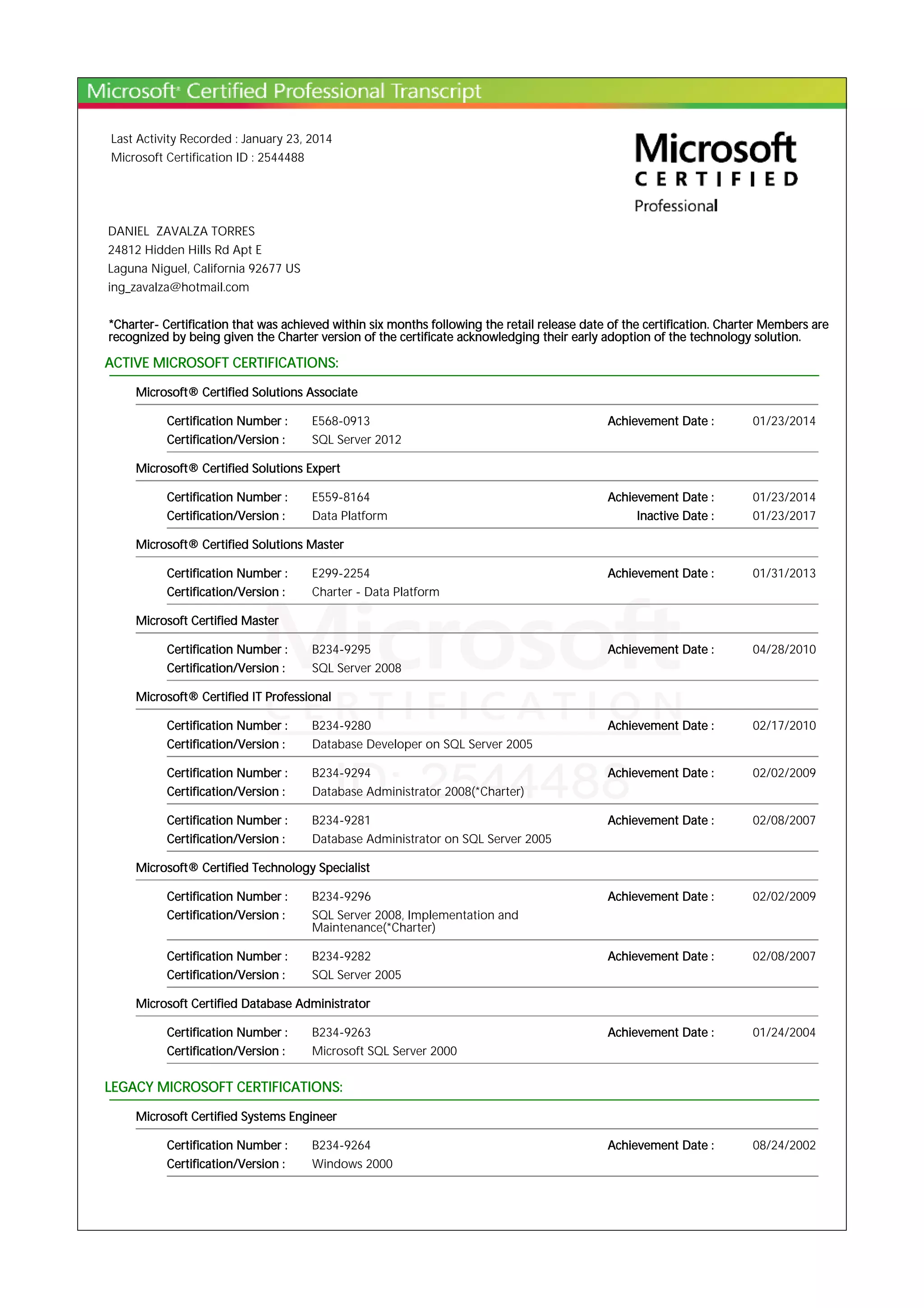 This document summarizes Daniel Zavalza Torres' Microsoft certifications. It shows that he has achieved several Microsoft certifications in databases and SQL Server, including Microsoft Certified Solutions Master (MCSM) in Data Platform, Microsoft Certified Solutions Expert (MCSE) in Data Platform, Microsoft Certified IT Professional (MCITP) in Database Developer on SQL Server 2005 and Database Administrator 2008, and Microsoft Certified Technology Specialist (MCTS) in SQL Server 2008 Implementation and Maintenance. It also lists the certification IDs and dates achieved for each certification.