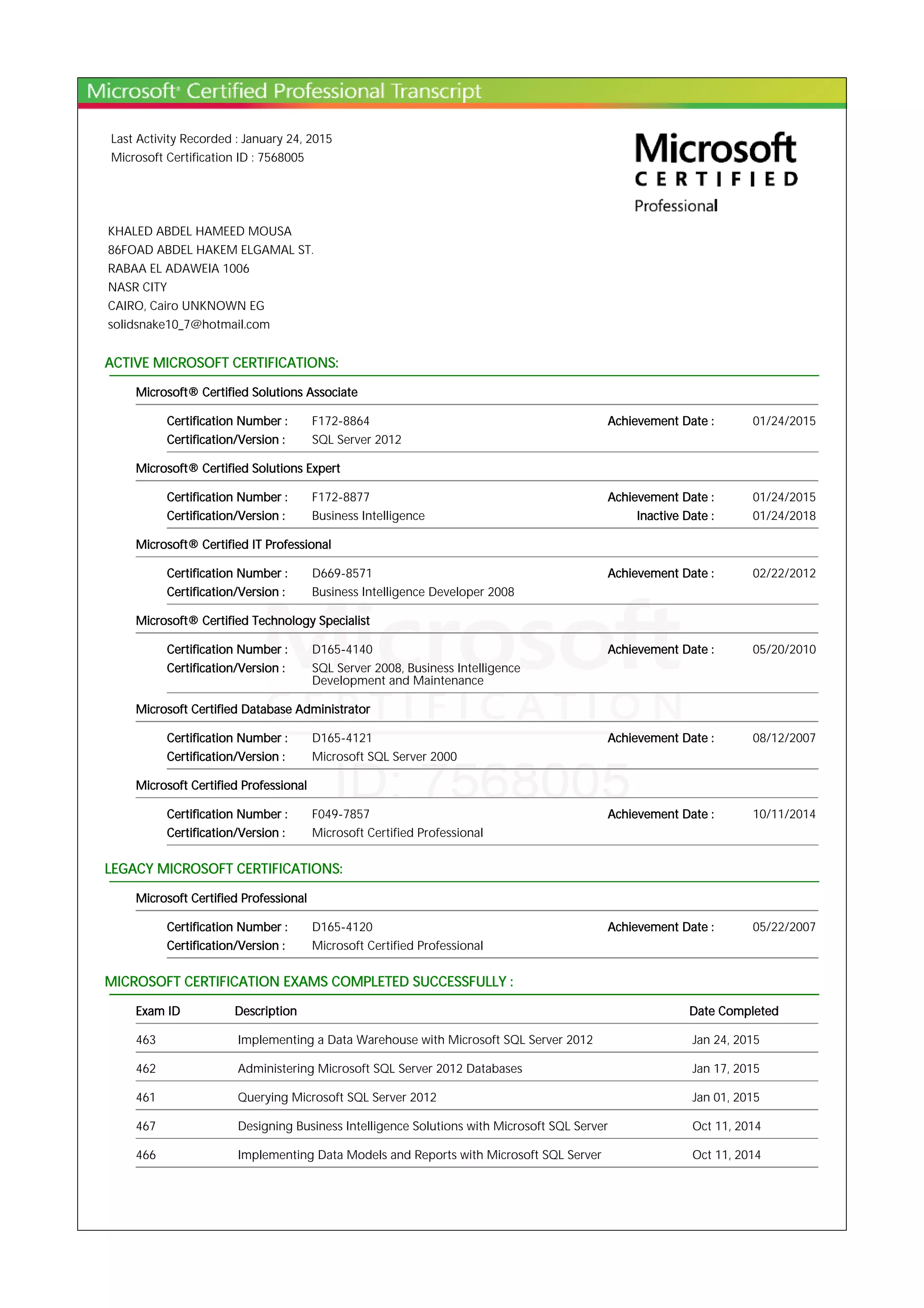 This document contains certification information for Khaled Abdel Hameed Mousa. It lists multiple active and legacy Microsoft certifications including: Microsoft Certified Solutions Associate (SQL Server 2012), Microsoft Certified Solutions Expert (Business Intelligence), Microsoft Certified IT Professional (Business Intelligence Developer 2008), Microsoft Certified Technology Specialist (SQL Server 2008, Business Intelligence Development and Maintenance), and Microsoft Certified Database Administrator (Microsoft SQL Server 2000). Contact information and details of certification exams passed are also provided.