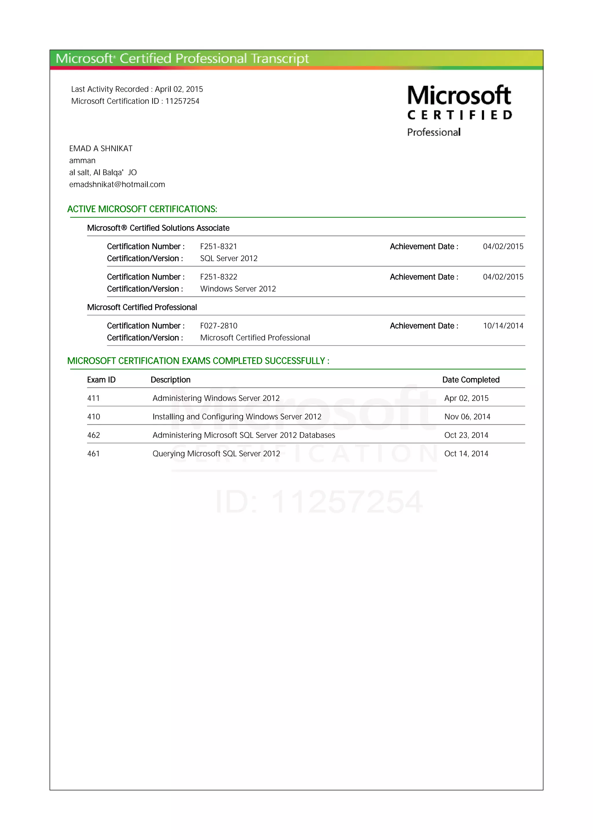 EMAD A SHNIKAT has multiple active Microsoft certifications including Microsoft Certified Solutions Associate for SQL Server 2012 and Windows Server 2012 as well as Microsoft Certified Professional. He has successfully completed exams to obtain these certifications for administering Windows Server 2012, installing and configuring Windows Server 2012, administering Microsoft SQL Server 2012 databases, and querying Microsoft SQL Server 2012.