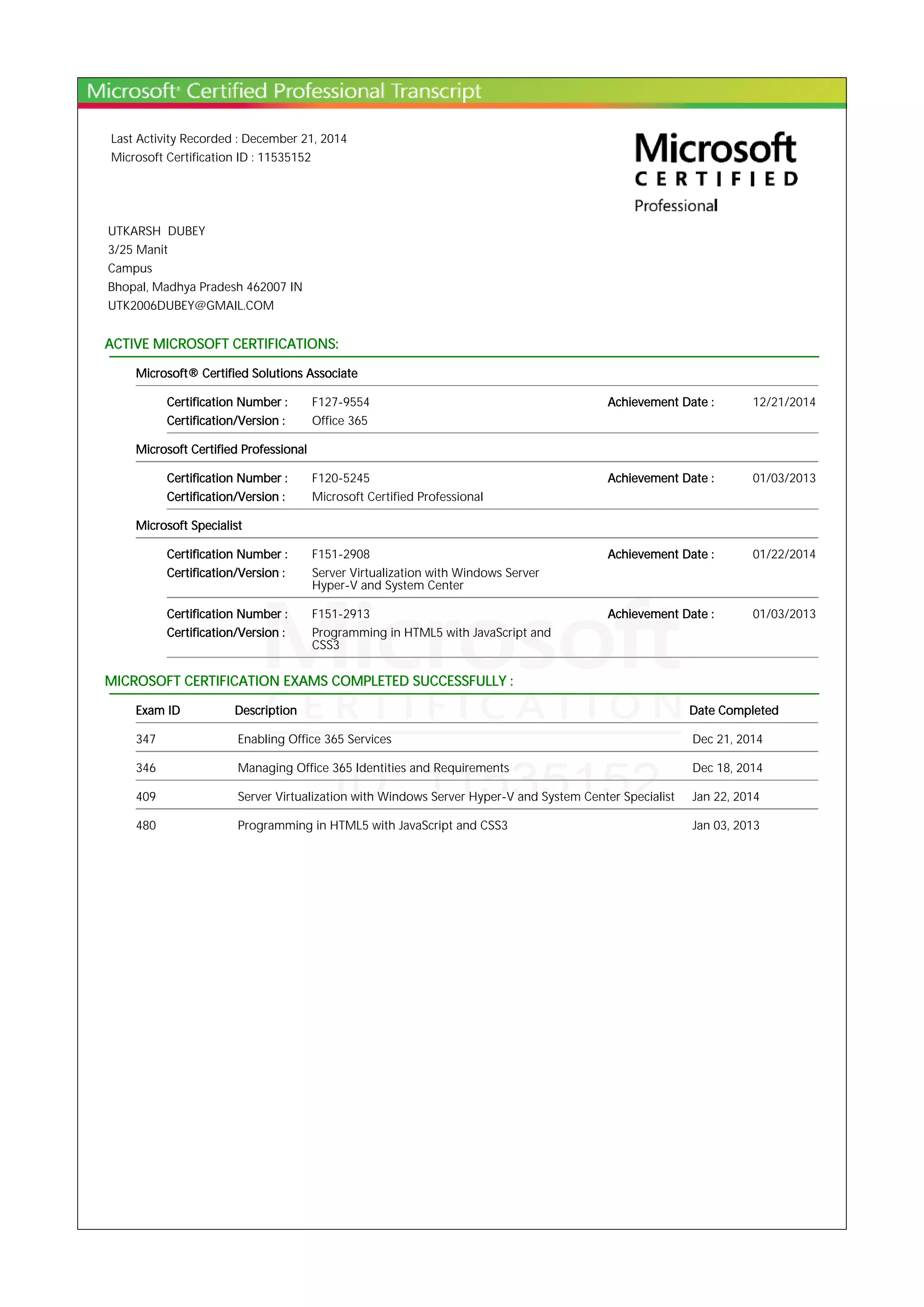 This document provides certification information for Utkarsh Dubey. It lists that his last activity was recorded on December 21, 2014 and provides his Microsoft Certification ID. It then lists his active Microsoft certifications, including Microsoft Certified Solutions Associate in Office 365 achieved on December 21, 2014, Microsoft Certified Professional achieved on January 3, 2013, and two Microsoft Specialist certifications in Server Virtualization with Windows Server Hyper-V and System Center achieved on January 22, 2014 and Programming in HTML5 with JavaScript and CSS3 achieved on January 3, 2013. It also lists two exams he successfully completed for the Office 365 certification and dates he completed them.