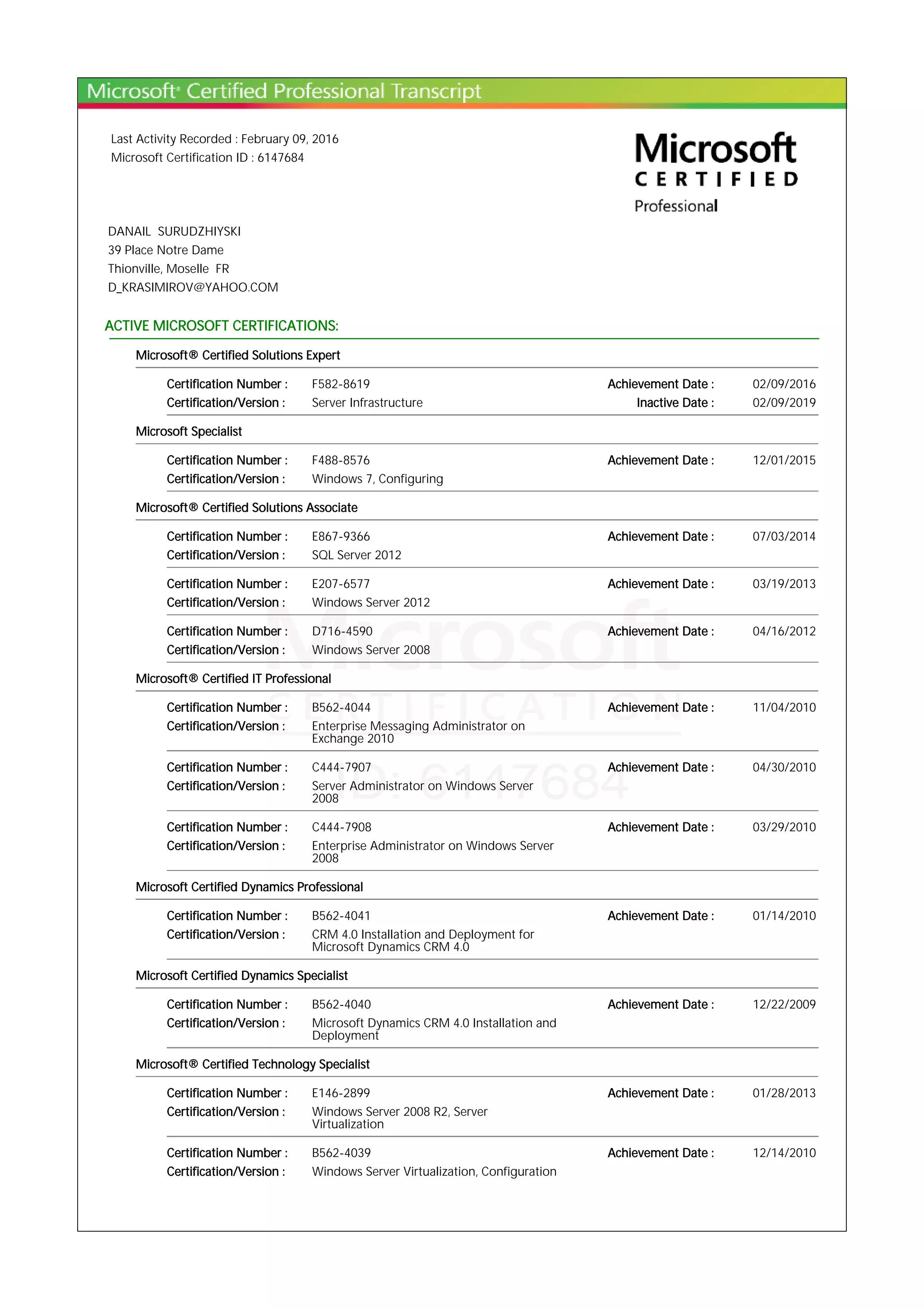 This document provides certification information for Danail Surudzhiski. It lists that he currently holds certifications including Microsoft Certified Solutions Expert (expiring in 2019) and Microsoft Specialist in Windows 7 Configuring. It also outlines his past certifications and the exams he has passed, such as SQL Server 2012, Windows Server 2012, and Exchange Server 2010.