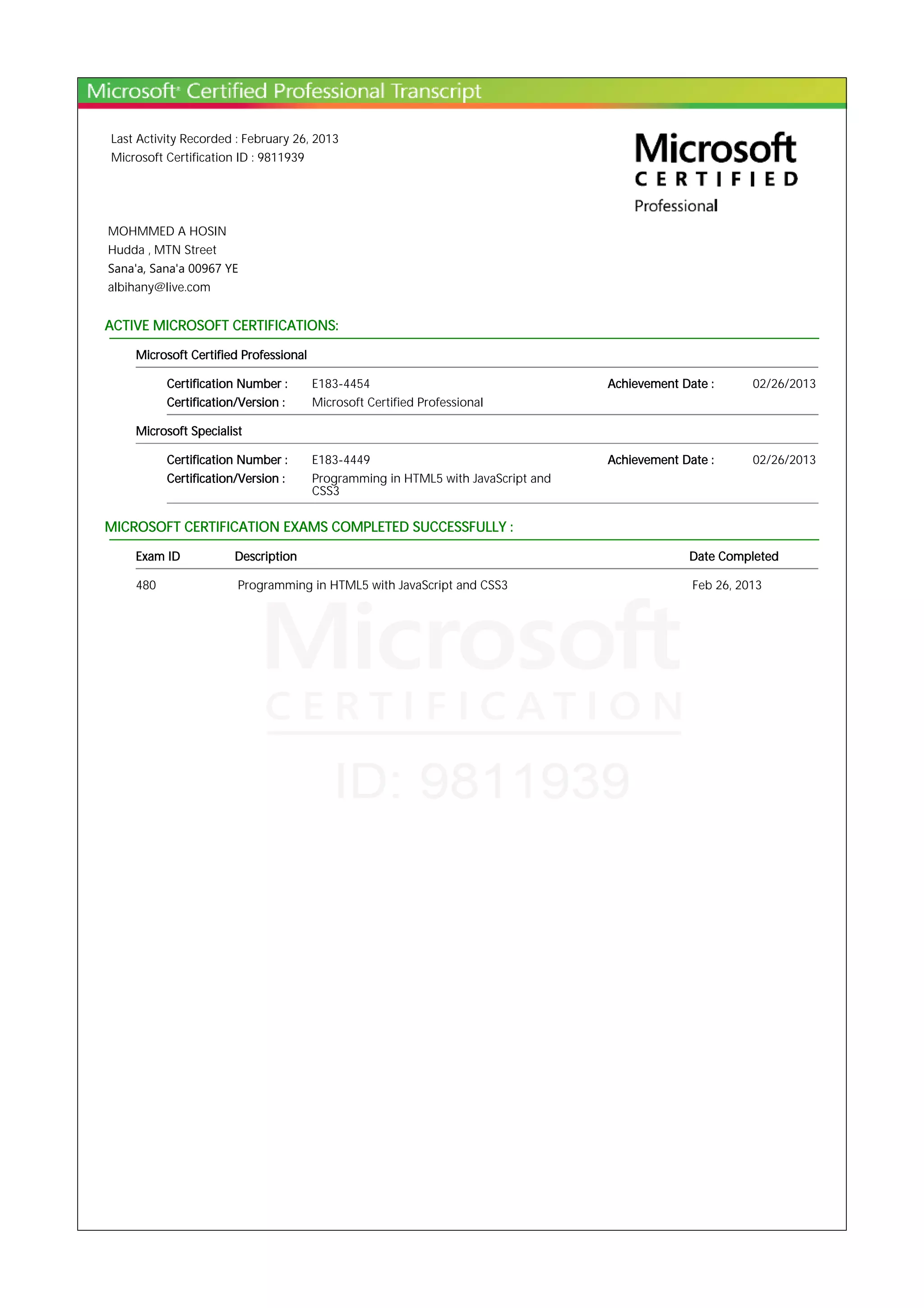 Mohmmed A Hosni has two active Microsoft certifications as of February 26, 2013 - Microsoft Certified Professional achieved on that date and Programming in HTML5 with JavaScript and CSS3 Specialist achieved on the same date. He successfully completed the exam for Programming in HTML5 with JavaScript and CSS3 on February 26, 2013.