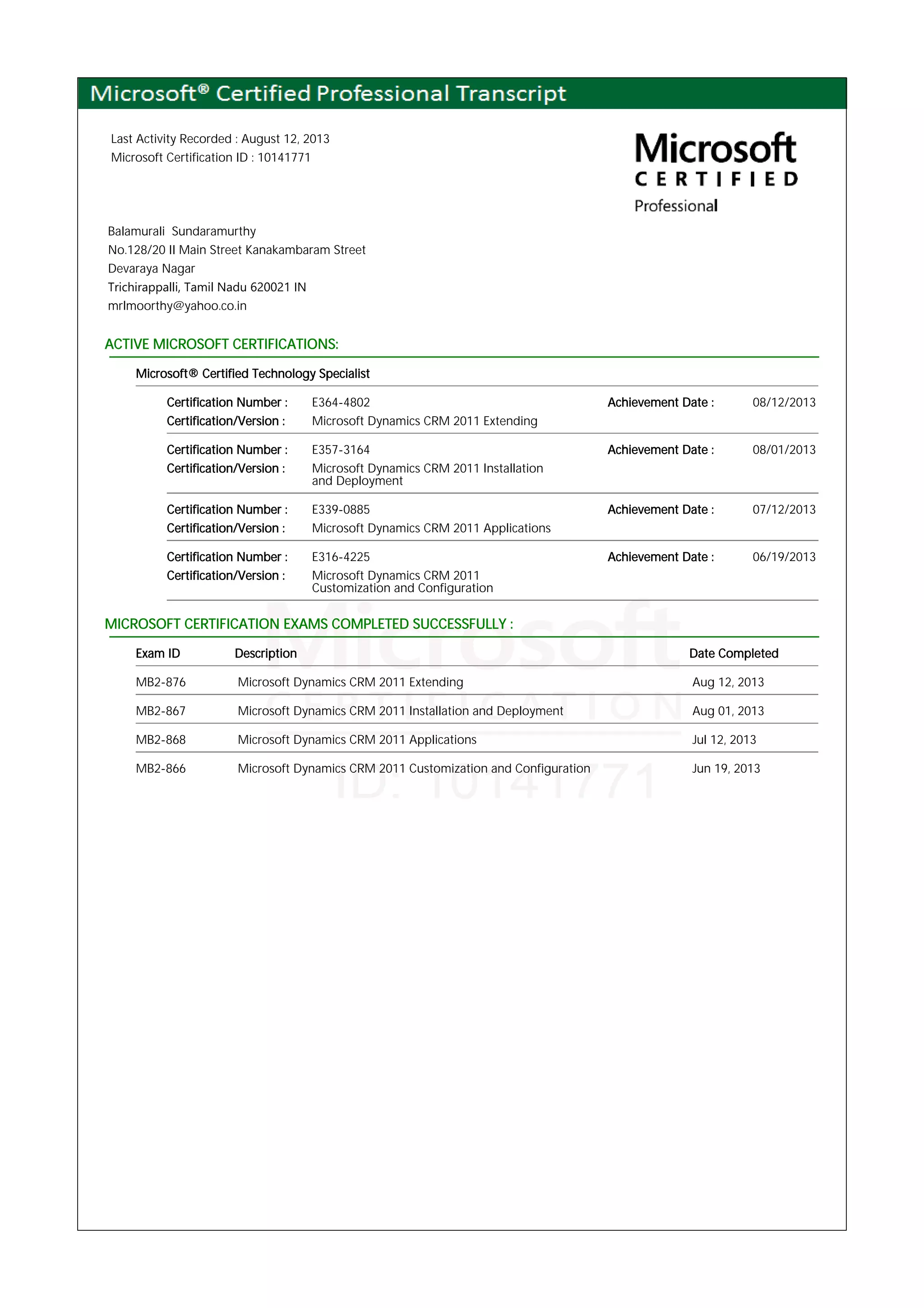 This document contains certification information for Balamurali Sundaramurthy, including his contact information, four active Microsoft Certifications related to Microsoft Dynamics CRM 2011 with dates earned, and details of the exams passed to earn each certification.