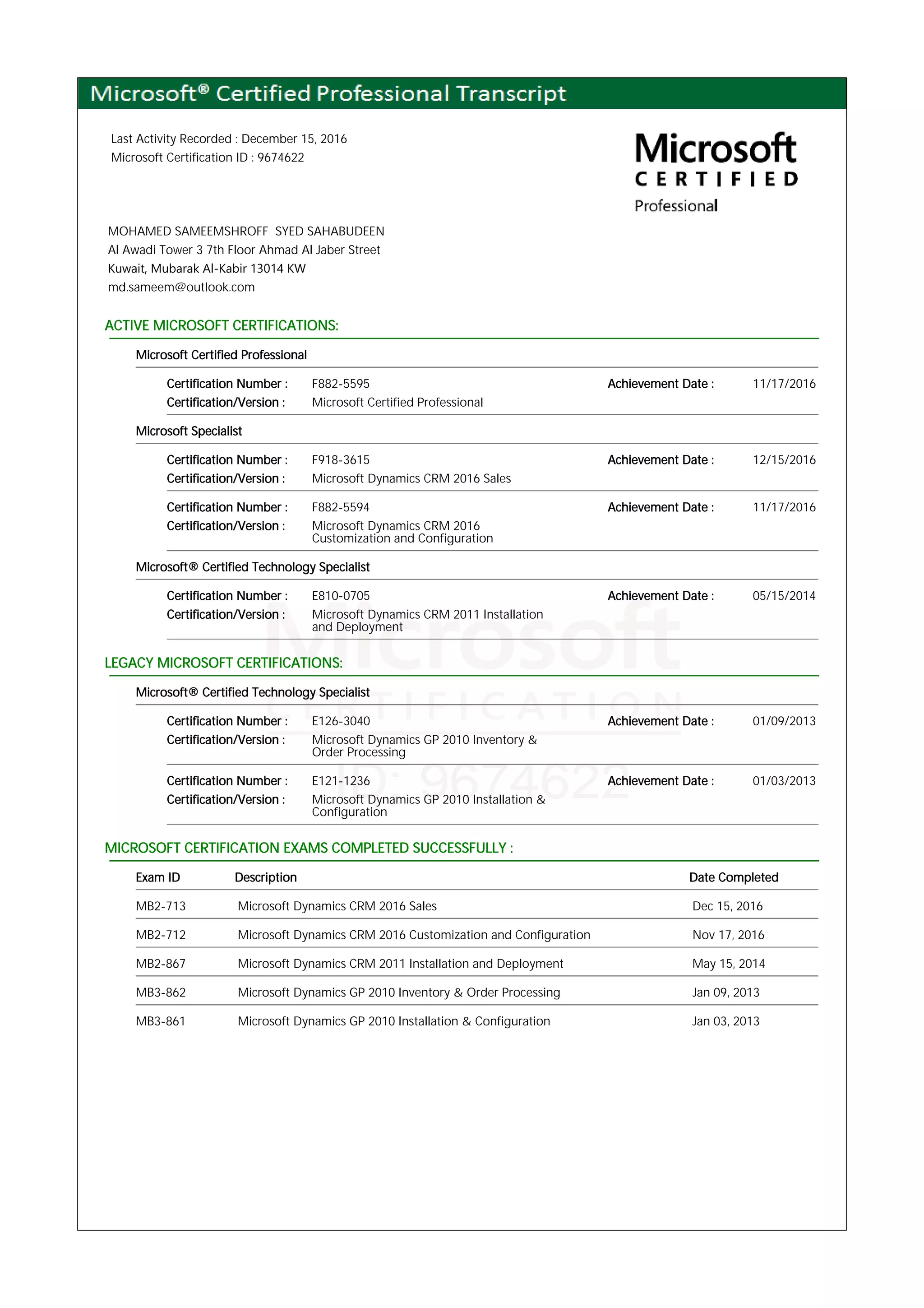 This document provides certification details for Mohamed Sameemshroff Syed Sahabudeen. It lists his active and legacy Microsoft certifications including Microsoft Certified Professional, Microsoft Specialist, and Microsoft Certified Technology Specialist certifications in Microsoft Dynamics CRM and GP. His certifications span from 2011 to 2016 and include exams passed in sales, customization, configuration, installation, and deployment.