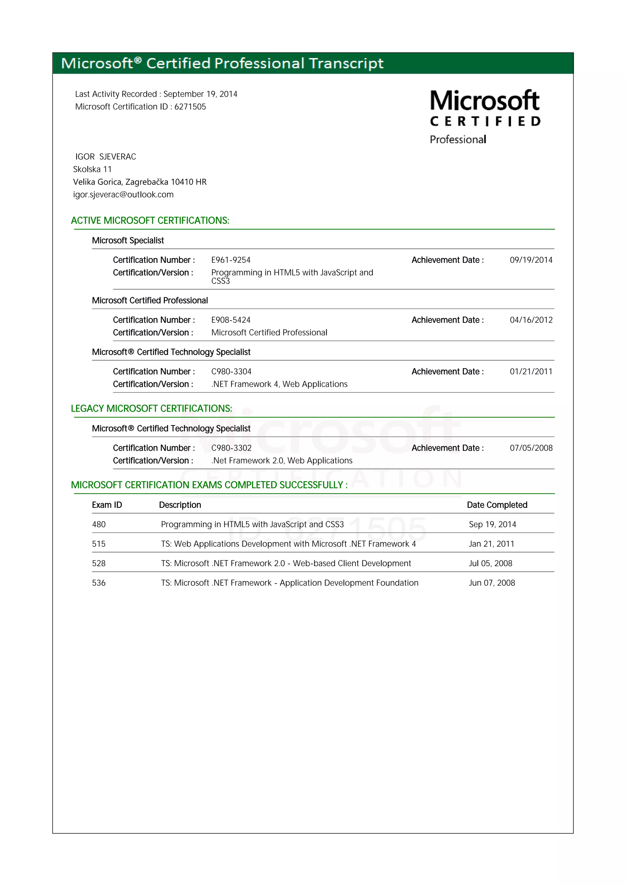 Igor Sjeverac has several active and legacy Microsoft certifications. His active certifications include Specialist in Programming in HTML5 with JavaScript and CSS3 from 2014, Microsoft Certified Professional from 2012, and Microsoft Certified Technology Specialist in .NET Framework 4 Web Applications from 2011. He also has a legacy Microsoft Certified Technology Specialist certification in .NET Framework 2.0 Web Applications from 2008. Sjeverac has successfully completed exams in Programming in HTML5, .NET Framework 4 Web Applications, .NET Framework 2.0 Web-based Client Development, and .NET Framework Application Development Foundation.