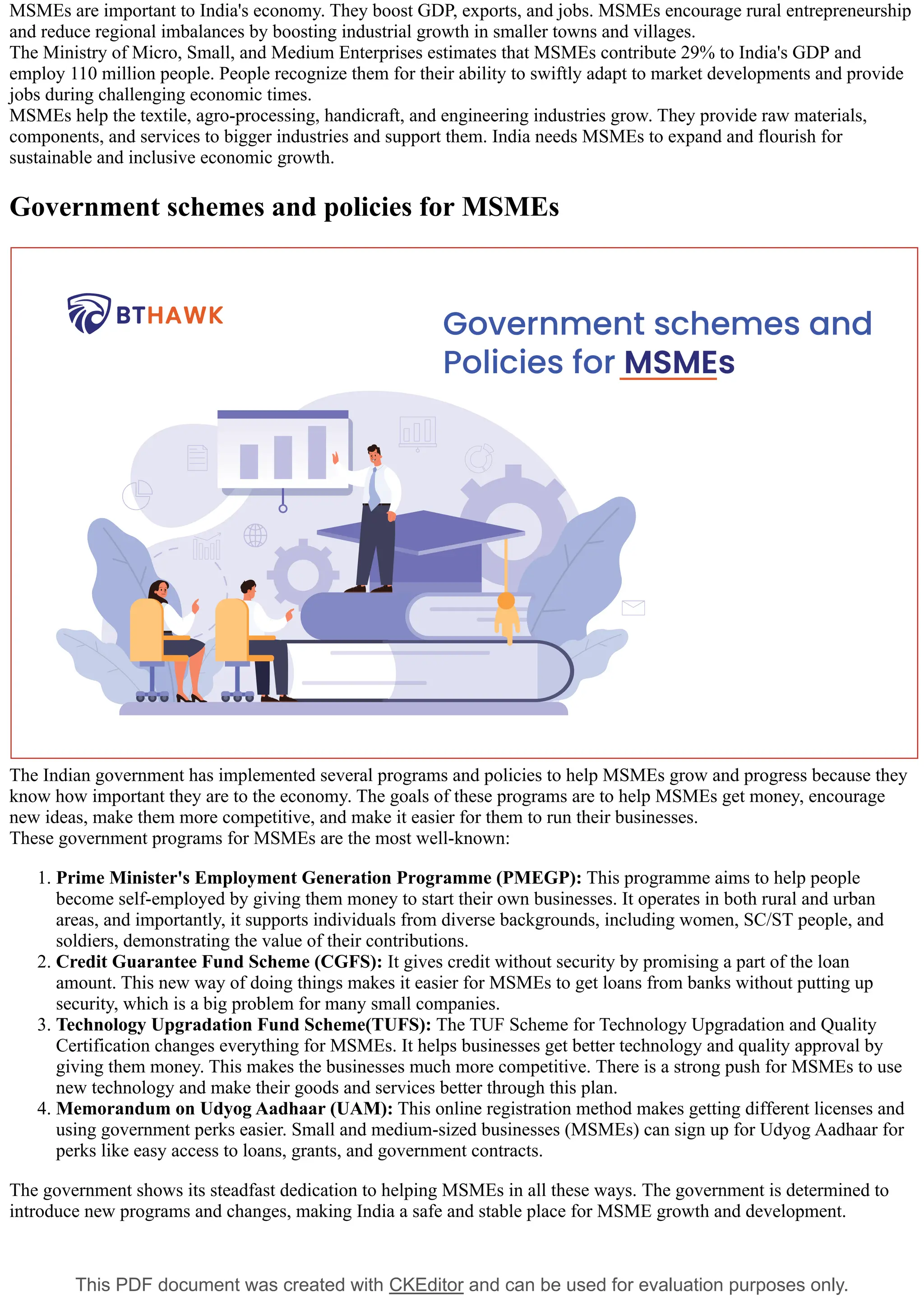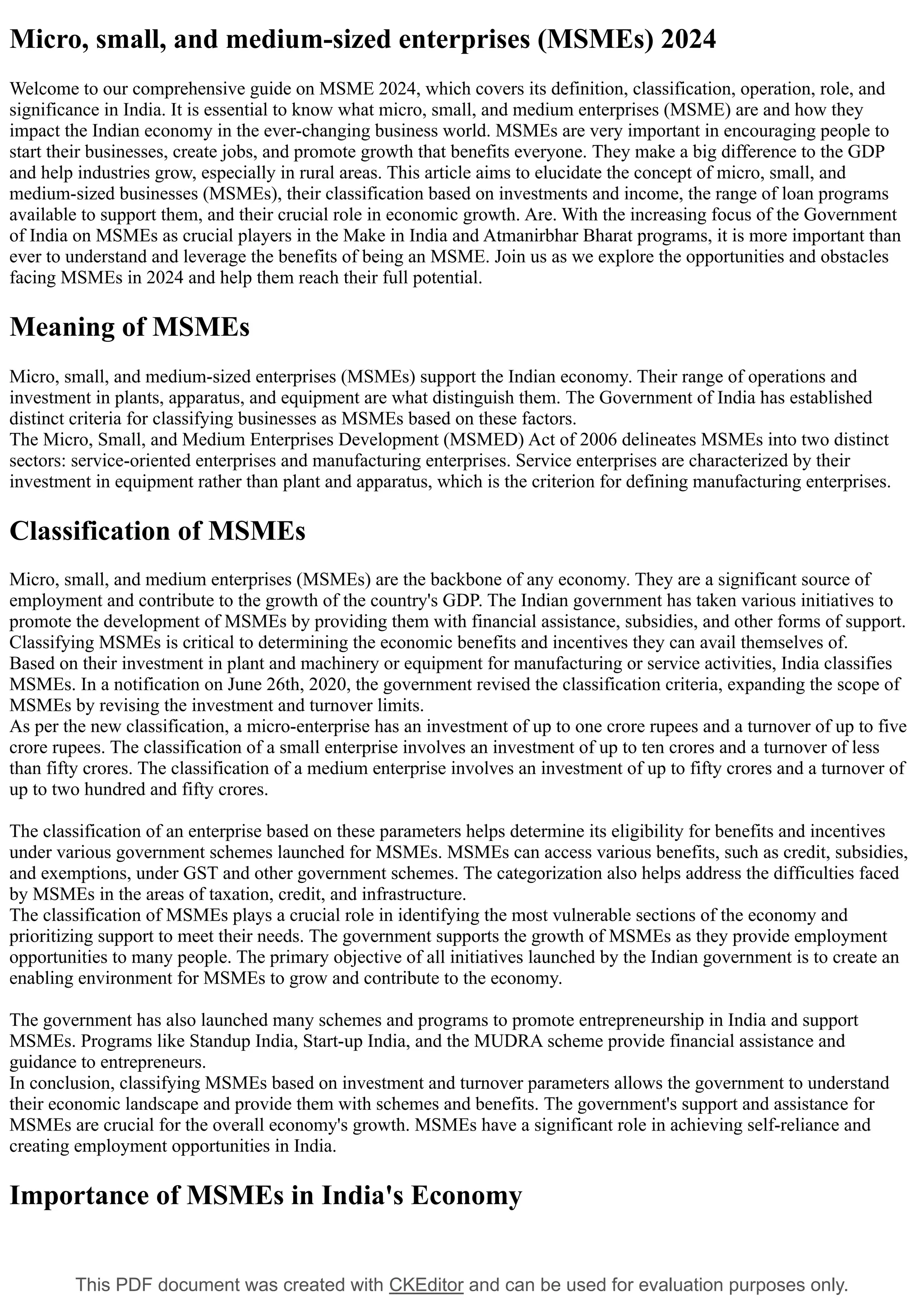 This document offers a comprehensive guide on micro, small, and medium-sized enterprises (MSMEs) in India, outlining their classification, roles, and significance in the economy. MSMEs are crucial for job creation and GDP growth, and the Indian government provides various financial support programs to enhance their development and competitiveness. The document highlights the importance of MSMEs in reducing poverty and promoting entrepreneurship, advocating for continued focus on their growth in the coming years.