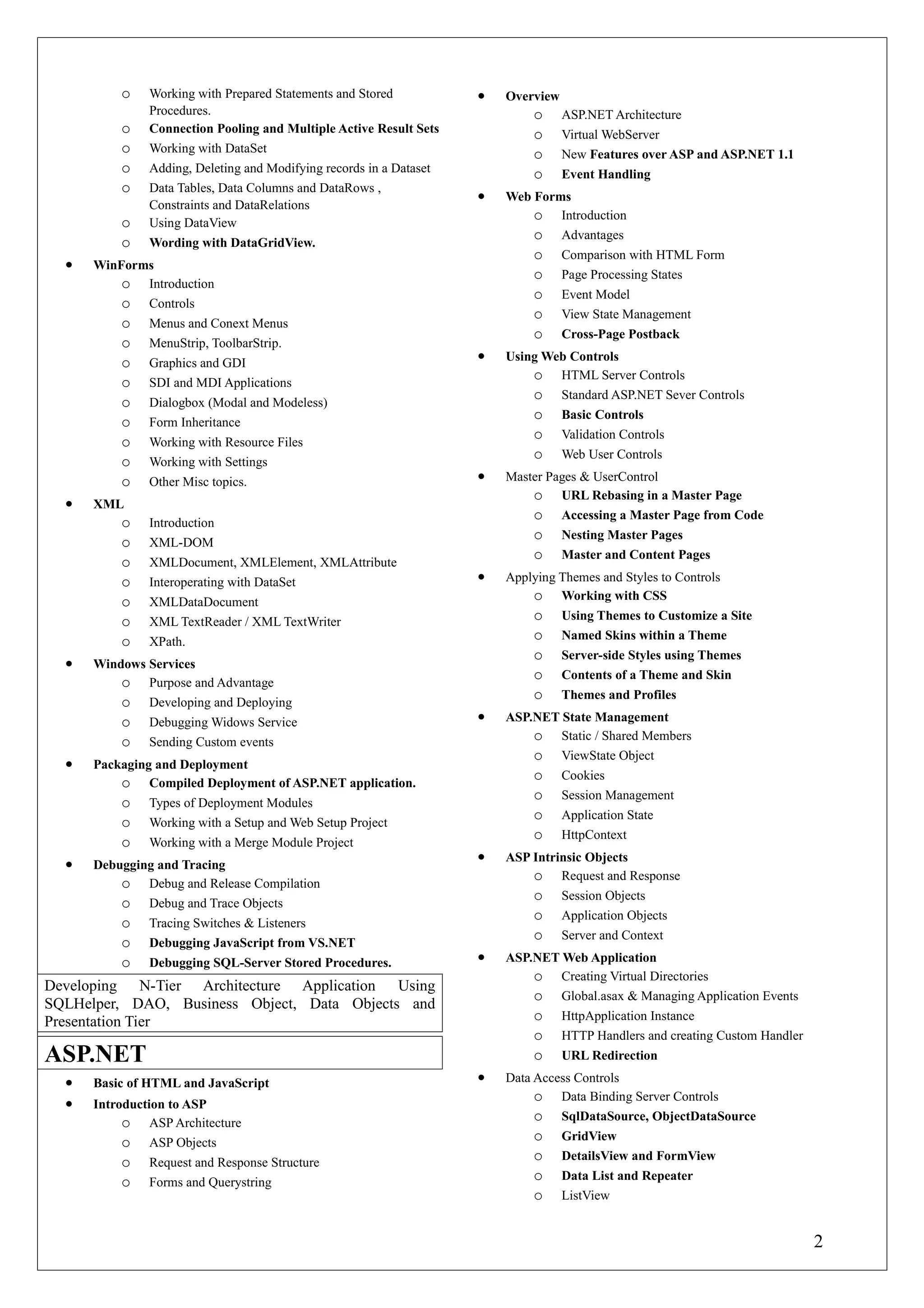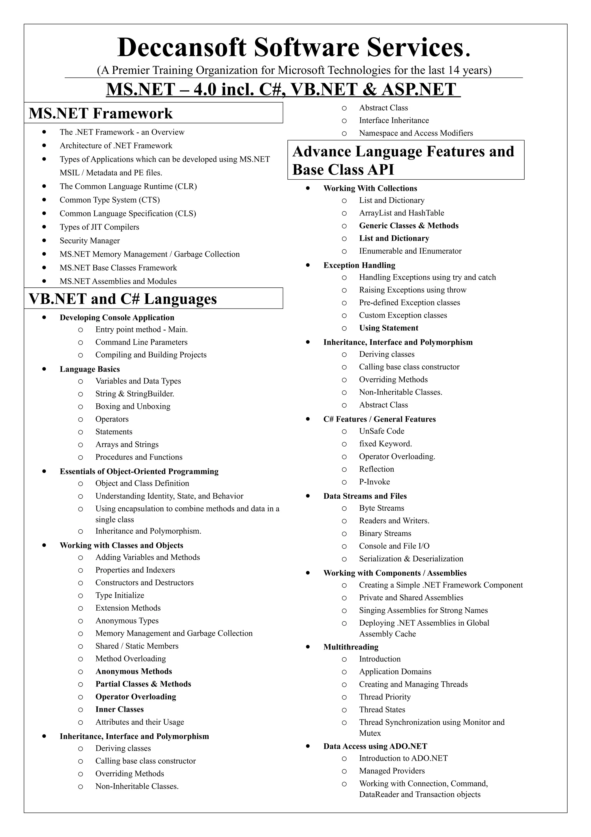Deccansoft Software Services is a premier training organization for Microsoft technologies that has been operating for 14 years. The document provides an overview of the MS.NET framework and describes various topics and technologies covered in MS.NET training courses including C#, VB.NET, ASP.NET, XML, Windows Forms, Windows Services, packaging and deployment, debugging, and distributed application development using techniques like web services and remoting. Contact information is provided for Deccansoft's headquarters and branch office.