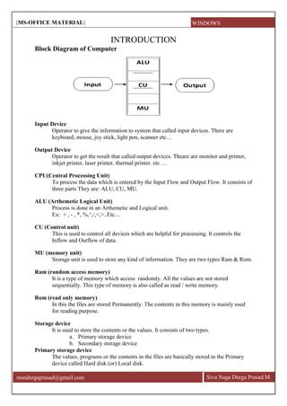 This document provides an overview of Microsoft Office, including Word, Excel, and PowerPoint. It discusses the basic functions and features of these applications, such as inserting tables, formatting text, adding headers and footers in Word, and setting up page layout options. The document is intended as a tutorial or instruction material for using MS Office.