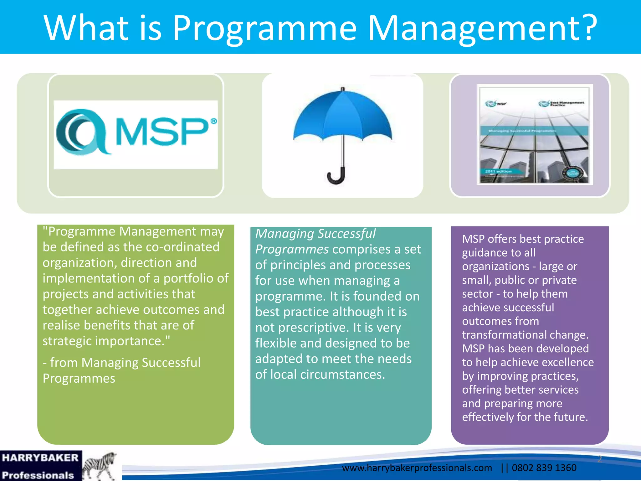 Managing Successful Programmes (MSP) provides best practice guidance for programme management. This document describes MSP qualifications offered by Harry Baker Professionals that teach programme management principles. Their MSP Foundation and Practitioner courses cover the MSP framework, processes, roles and help participants apply it to transformational change initiatives. Customers praise Harry Baker Professionals' trainers and materials for helping them understand programme management concepts and pass MSP exams.