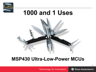 The document discusses the MSP430 microcontroller family from Texas Instruments. It provides an overview of the MSP430 architecture including its ultra-low power capabilities, peripherals, and development tools. Specific MSP430 derivatives and their features are also highlighted.