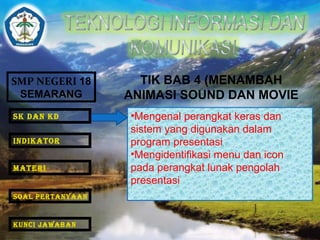 Dokumen tersebut memberikan informasi mengenai penggunaan program PowerPoint untuk menambahkan animasi, video, dan audio ke dalam presentasi serta cara mempresentasikannya. Materi yang disajikan mencakup pengaturan animasi, transisi slide, hyperlink, dan cara mempresentasikan presentasi secara berulang-ulang.