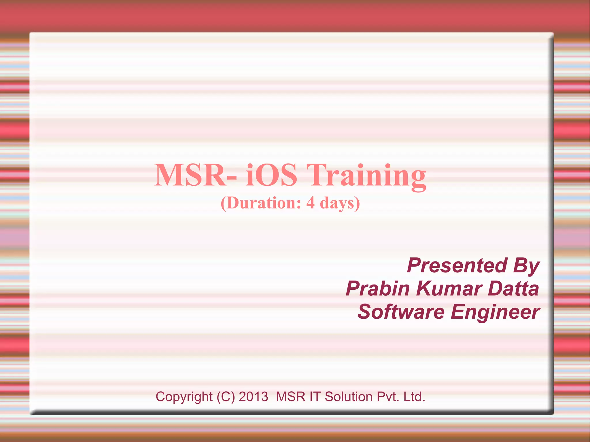 This 4-day training course covers iOS application development and security. Day 1 introduces iOS, Objective-C, and setting up development environments. Day 2 covers native, web, and hybrid mobile app types and the app development process. Day 3 discusses debugging, app store publishing, and iOS technologies. Day 4 focuses on application security best practices including data security, keychain usage, and penetration testing tools and techniques.