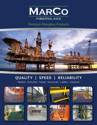 This document provides information on Marco Fiberglass premium fiberglass products including molded and pultruded fiberglass gratings. It details the various resin types used, their corrosion resistance and fire ratings. Product lines include molded fiberglass products in various styles and surfaces, as well as pultruded fiberglass gratings. Application examples and technical specifications are provided for the different grating styles.